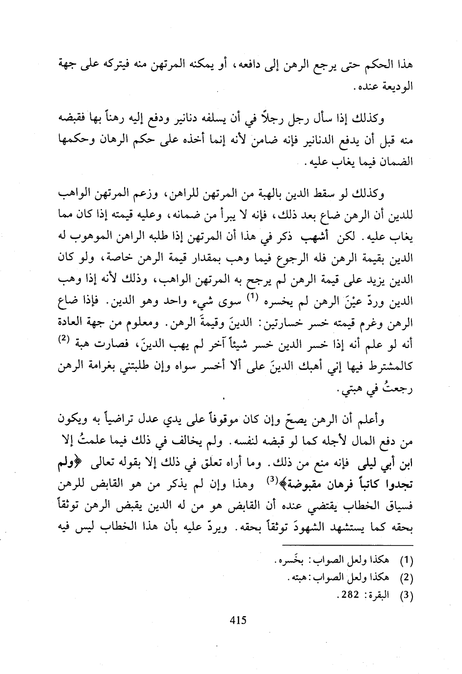وكذلك إذا سأل رجل رجلًا في أن يسلفه دنانير ودفع إليه رهنًا بها فقبضه منه قبل أن يدفع الدنانير فإنه ضامن لأنه إنما أخذه على حكم الرهبان وحكمها الضمان فيما يغاب عليه.