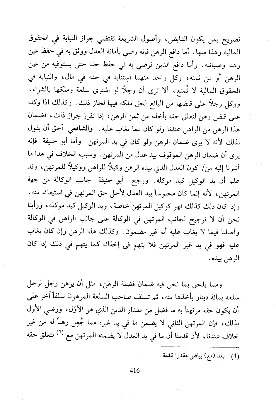 تصريح بمن يكون القابض، وأصول الشريعة تقتضي جواز النيابة في الحقوق المالية وهذا منها. أما دافع الرهن فإنه رضي بأمانة العدل ووثق به في حفظ عين رهنه وصيانته. وأما دافع الدين فرضي به في حفظ حقه حتى يستوفيه من عين الرهن أو من ثمنه، وكل واحد منهما استبانة في حقه في مال، والنيابة في الحقوق المالية لا تُمنع، ألا ترى أن رجلًا لو اشترى سلعة وملكها بالشراء، ووكل رجلًا على قبضها من البائع لحق ملكه فيها لجاز ذلك. وكذلك إذا وكله على قبض رهن لتعلق حقه بأخذه من ثمن الرهن، إذا تقرر جواز ذلك، فضمان هذا الرهن من الراهن عندنا ولو كان مما يغاب عليه. والشافعي أحق أن يقول بذلك لأنه لا يرى ضمان الرهن ولو كان في يد المرتهن. وأما أبو حنيفة فإنه يرى أن ضمان الرهن الموقوف بيد عدل من المرتهن. وسبب الخلاف في هذا ما أشرنا إليه من كون العدل الذي بيده الرهن وكيلًا للراهن ووكيلًا للمرتهن، وقد علم أن يد الوكيل كيد موكله. ورجح أبو حنيفة جانب الوكالة من جهة المرتهن؛ لأنه إنما كان محبوسًا بيد العدل لأجل حق المرتهن في استيفائه منه.