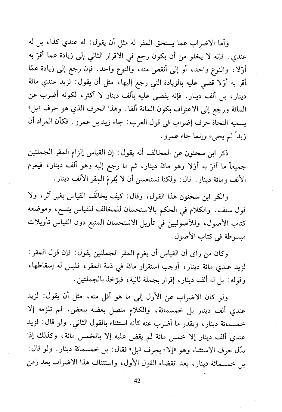 وانكر ابن سحنون هذا القول، وقال: كيف يخالَف القياس بغير أثر، ولا قول سلف. والكلام في الحكم بالاستحسان للمخالف للقياس يتسع، وموضعه كتاب الأصول، وللأصوليين في تأويل الانشحسان المتبع دون القياس تأويلات مبسوطة في كتاب الأصول.