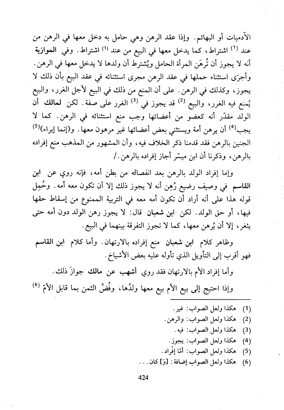 وأجرَى استثناء حملها في عقد الرهن مجرى استثنائه في عقد البيع بأن ذلك لا يجوز، وكذلك في الرهن. على أن المنع من ذلك في البيع لأجل الغرر، والبيع يُمنع فيه الغرر، والبيع (¬2) قد يجوز في (¬3) الغرر على صفة. لكن لمالك أن الولد مقدّر أنه كعضو من أعضائها وجب منع استثنائه في الرهن. كما لا يجب (¬4) أن يرهن أمة ويستثني بعض أعضائها غير مرهون معها. و (إنما إبراء) (¬5) الجنين بالركن فقد قدمنا ذكر الخلاف فيه، وأن المشهور من المذهب منع إفراده بالرهن، وذكرنا أن ابن ميسّر أجاز إفراده بالرهن.