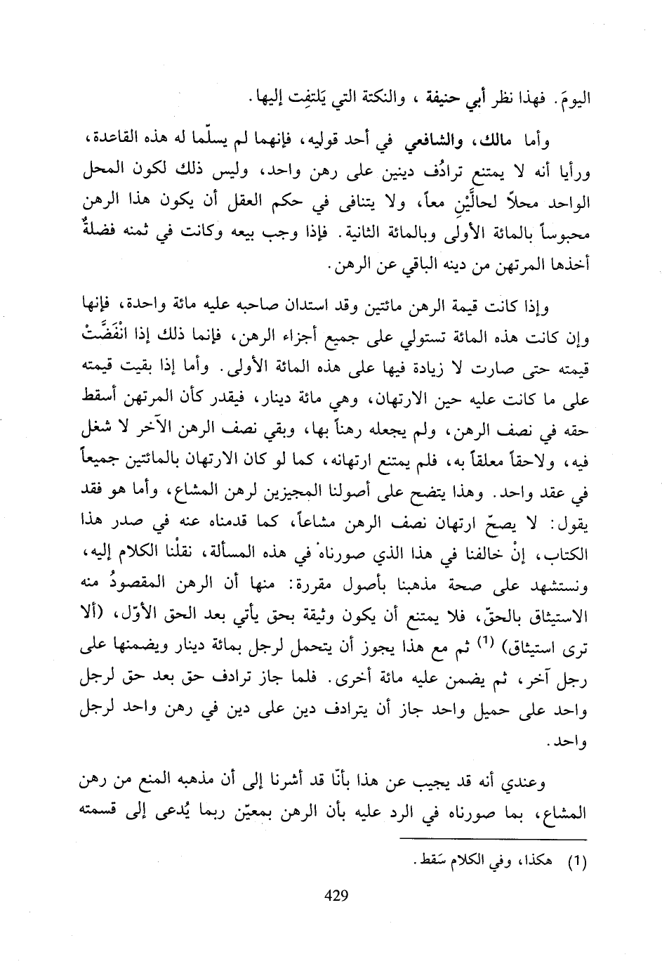 وأما مالك، والشافعي في أحد قوليه، فإنهما لم يسلّما له هذه القاعدة، ورأيا أنه لا يمتنع ترادُف دينين على رهن واحد، وليس ذلك لكون المحل الواحد محلًا لحالَّيْنِ معًا، ولا يتنافى في حكم العقل أن يكون هذا الرهن محبوسًا بالمائة الأولى وبالمائة الثانية. فإذا وجب بيعه وكانت في ثمنه فضلةٌ أخذها المرتهن من دينه الباقي عن الرهن.