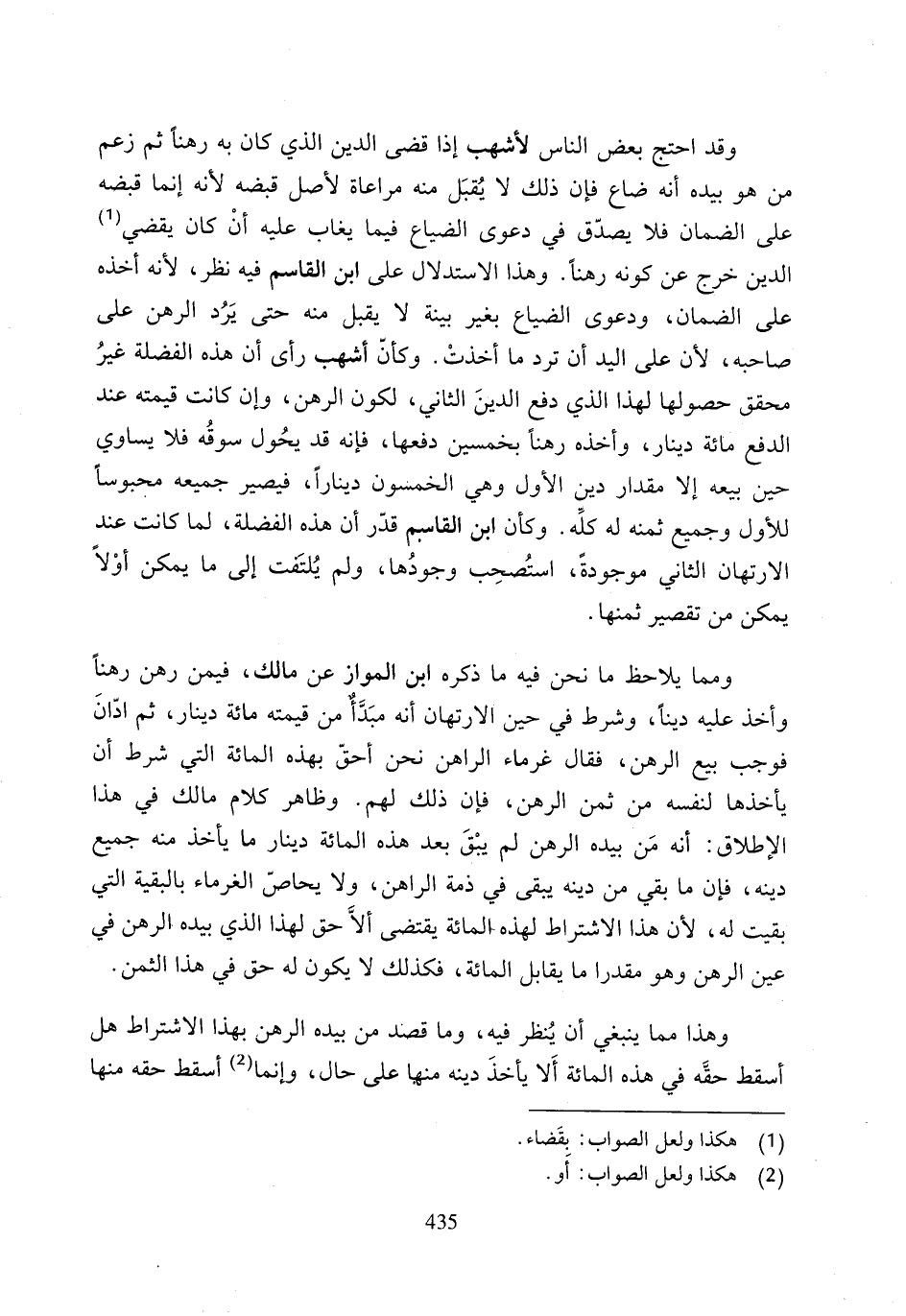 وقد احتج بعض الناس لأشهب إذا قضى الدين الذي كان به رهنًا ثم زعم من هو بيده أنه ضاع فإن ذلك لا يُقبَل منه مراعاة لأصل قبضه لأنه إنما قبضه على الضمان فلا يصدّق في دعوى الضياع فيما يغاب عليه أنْ كان يقضي (¬1) الدين خرج عن كونه رهنًا. وهذا الاستدلال على ابن القاسم فيه نظر, لأنه أخذه على الضمان، ودعوى الضياع بغير بينة لا يقبل منه حتى يَرُد الرهن على صاحبه, لأن على اليد أن ترد ما أخذتْ. وكأنّ أشهب رأى أن هذه الفضلة غيرُ محقق حصولها لهذا الذي دفع الدينَ الثاني، لكون الرهن، وإن كانت قيمته عند الدفع مائة دينار، وأخذه رهنًا بخمسين دفعها، فإنه قد يحُول سوقُه فلا يساوي حين بيعه إلا مقدار دين الأول وهي الخمشون دينارًا، فيصير جميعه محبوسًا للأول وجميع ثمنه له كلَّه. وكأن ابن القاسم قدّر أن هذه الفضلة، لما كانت عند الارتهان الثاني موجودةً، استُصحِب وجودُها, ولم يُلتَفت إلى ما يمكن أوْلًا يمكن من تقصير ثمنها.