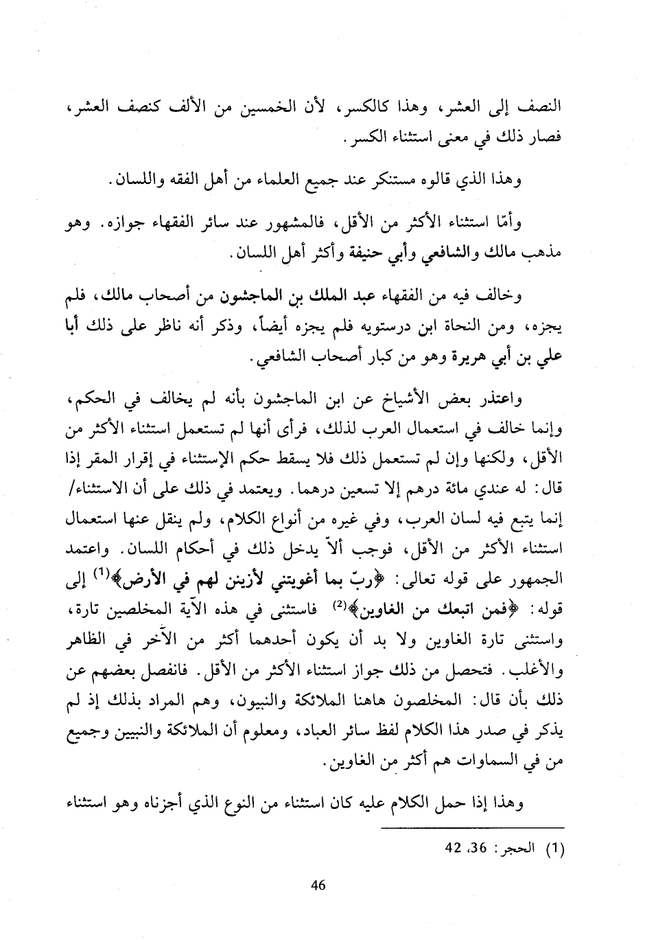 واعتذر بعض الأشياخ عن ابن الماجشون بأنه لم يخالف في الحكم، وإنما خالف في استعمال العرب لذلك، فرأى أنها لم تستعمل استثناء الأكثر من الأقل، ولكنها وإن لم تستعمل ذلك فلا يسقط حكم الإستثناء في إقرار المقر إذا قال: له عندي مائة درهم إلا تسعين درهما. ويعتمد في ذلك على أن الاستثناء إنما يتبع فيه لسان العرب، وفي غيره من أنواع الكلام، ولم ينقل عنها استعمال استثناء الأكثر من الأقل، فوجب ألا يدخل ذلك في أحكام اللسان. واعتمد الجمهور على قوله تعالى: {رَبِّ بِمَا أَغْوَيْتَنِي لَأُزَيِّنَنَّ لَهُمْ في الْأَرْضِ} (¬1) إلى قوله: {مَنِ اتَّبَعَكَ مِنَ الْغَاوِينَ} (1) فاستثنى في هذه الآية المخلصين تارة، واستثنى تارة الغاوين ولا بد أن يكون أحدهما أكثر من الآخر في الظاهر والأغلب. فتحصل من ذلك جواز استثناء الأكثر من الأقل. فانفصل بعضهم عن ذلك بأن قال: المخلصون ها هنا الملائكة والنبيون، وهم المراد بذلك إذ لم يذكر في صدر هذا الكلام لفظ سائر العباد، ومعلوم أن الملائكة والنبيين وجميع من في السماوات هم أكثر من الغاوين.
