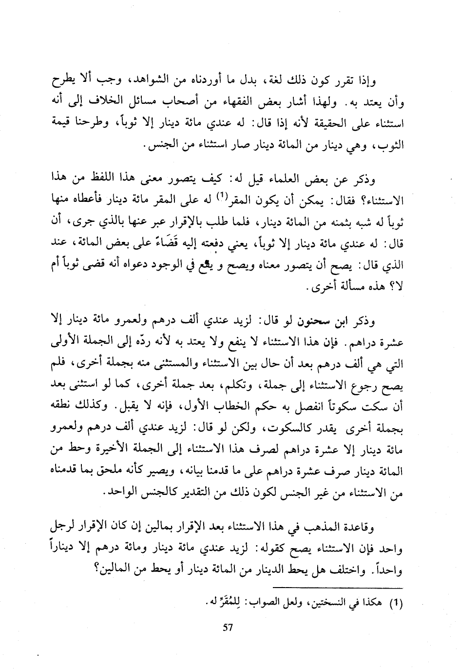 وإذا تقرر كون ذلك لغة، بدل ما أوردناه من الشواهد، وجب ألا يطرح وأن يعتد به. ولهذا أشار بعض الفقهاء من أصحاب مسائل الخلاف إلى أنه استثناء على الحقيقة لأنه إذا قال: له عندي مائة دينار إلا ثوبًا، وطرحنا قيمة الثوب، وهي دينار من المائة دينار صار استثناء من الجنس.