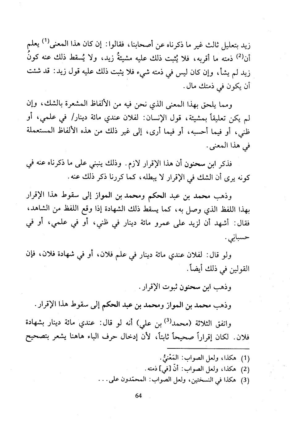 وذهب محمَّد بن عبد الحكم ومحمد بن المواز إلى سقوط هذا الإقرار بهذا اللفظ الذي وصل به، كما يسقط ذلك الشهادة إذا وقع اللفظ من الشاهد، فقال: أشهد أن لزيد على عمرو مائة دينار في ظني، أو في علمي، أو في حسبانِي.