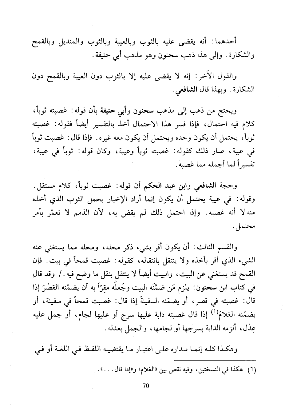 ويحتج من ذهب إلى مذهب سحنون وأبي حنيفة بأن قوله: غصبته ثوبًا، كلام فيه احتمال، فإذا فسر هذا الاحتمال أخذ بالتفسير أيضًا فقوله: غصبته ثوبًا، يحتمل أن يكون وحده ويحتمل أن يكون معه غيره. فإذا قال: غصبت ثوبًا في عيبة، صار ذلك كقوله: غصبته ثوبًا وعيبة، وكان قوله: ثوبًا في عيبة، تفسيرًا لما أجمله مما غصبه.
