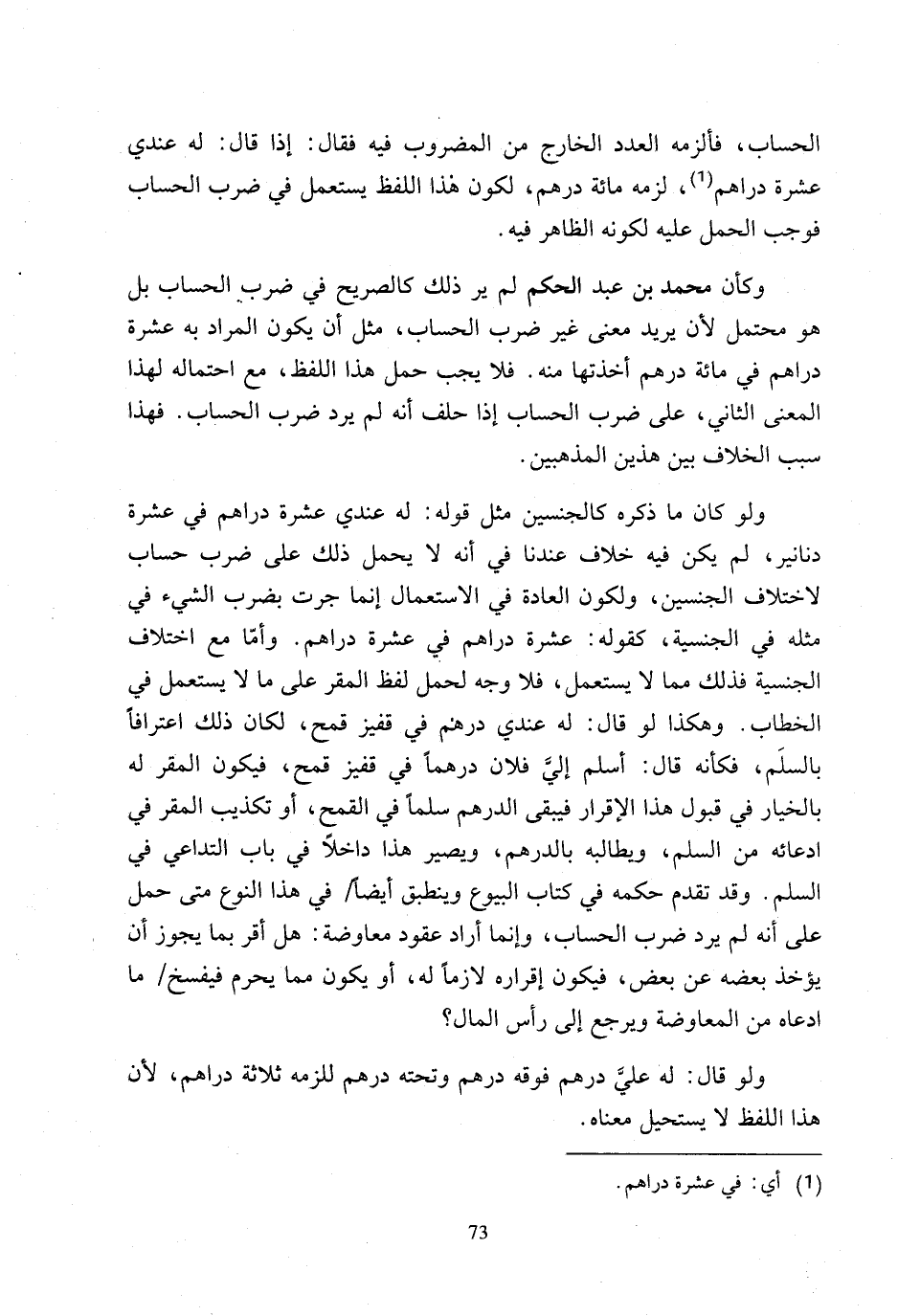 وكأن محمَّد بن عبد الحكم لم ير ذلك كالصريح في ضرب الحساب بل هو محتمل لأن يريد معنى غير ضرب الحساب، مثل أن يكون المراد به عشرة دراهم في مائة درهم أخذتها منه. فلا يجب حمل هذا اللفظ، مع احتماله لهذا المعنى الثاني، على ضرب الحساب إذا حلف أنه لم يرد ضرب الحساب. فهذا سبب الخلاف بين هذين المذهبين.