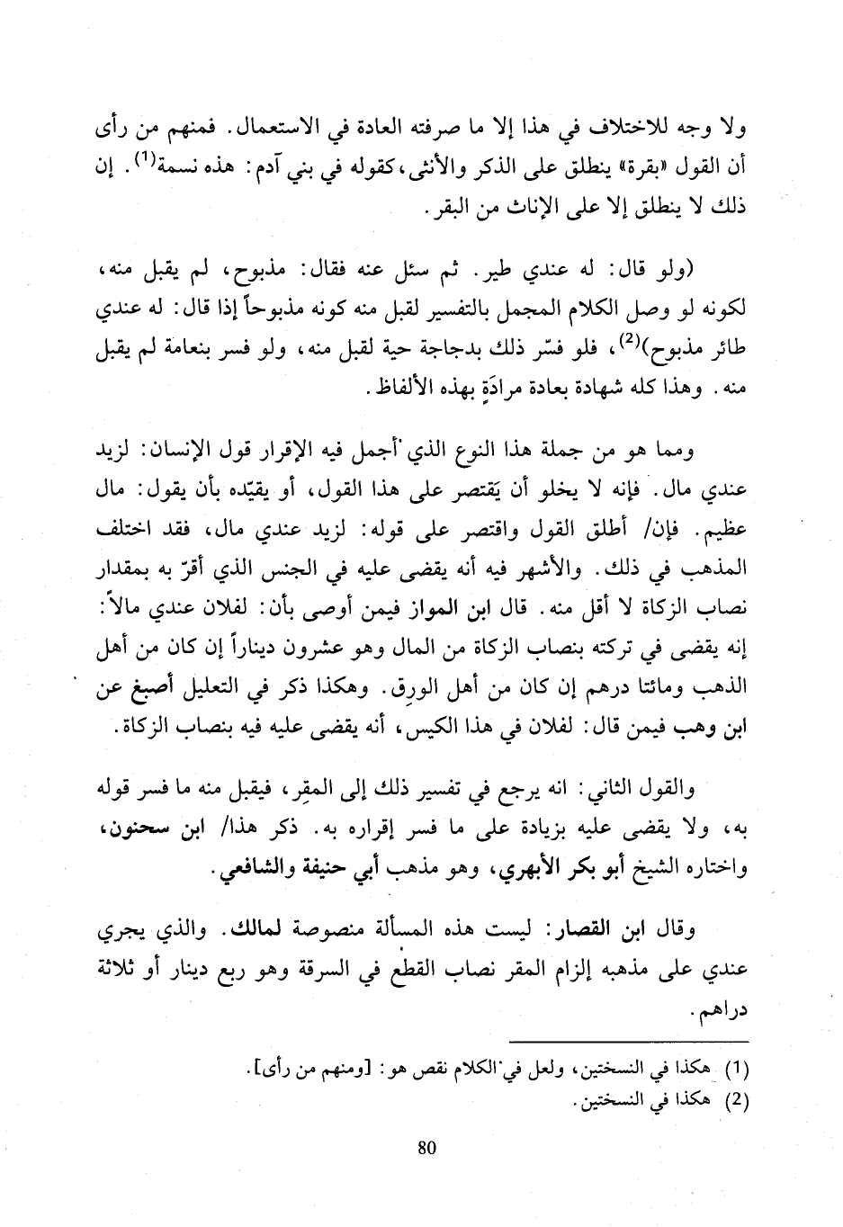 ومما هو من جملة هذا النوع الذي أجمل فيه الإقرار قول الإنسان: لزيد عندي مال. فإنه لا يخلو أن يَقتصر على هذا القول، أو يقيّده بأن يقول: مال عظيم. فإن أطلق القول واقتصر على قوله: لزيد عندي مال، فقد اختلف المذهب في ذلك. والأشهر فيه أنه يقضى عليه في الجنس الذي أقرّ به بمقدار نصاب الزكاة لا أقل مثله. قال ابن المواز فيمن أوصى بأن: لفلان عندي مالًا: إنه يقضى في تركته بنصاب الزكاة من المال وهو عشرون دينارًا إن كان من أهل الذهب ومائتا درهم إن كان من أهل الورِق. وهكذا ذكر في التعليل أصبغ عن ابن وهب فيمن قال: لفلان في هذا الكيس، أنه يقضى عليه فيه بنصاب الزكاة.
