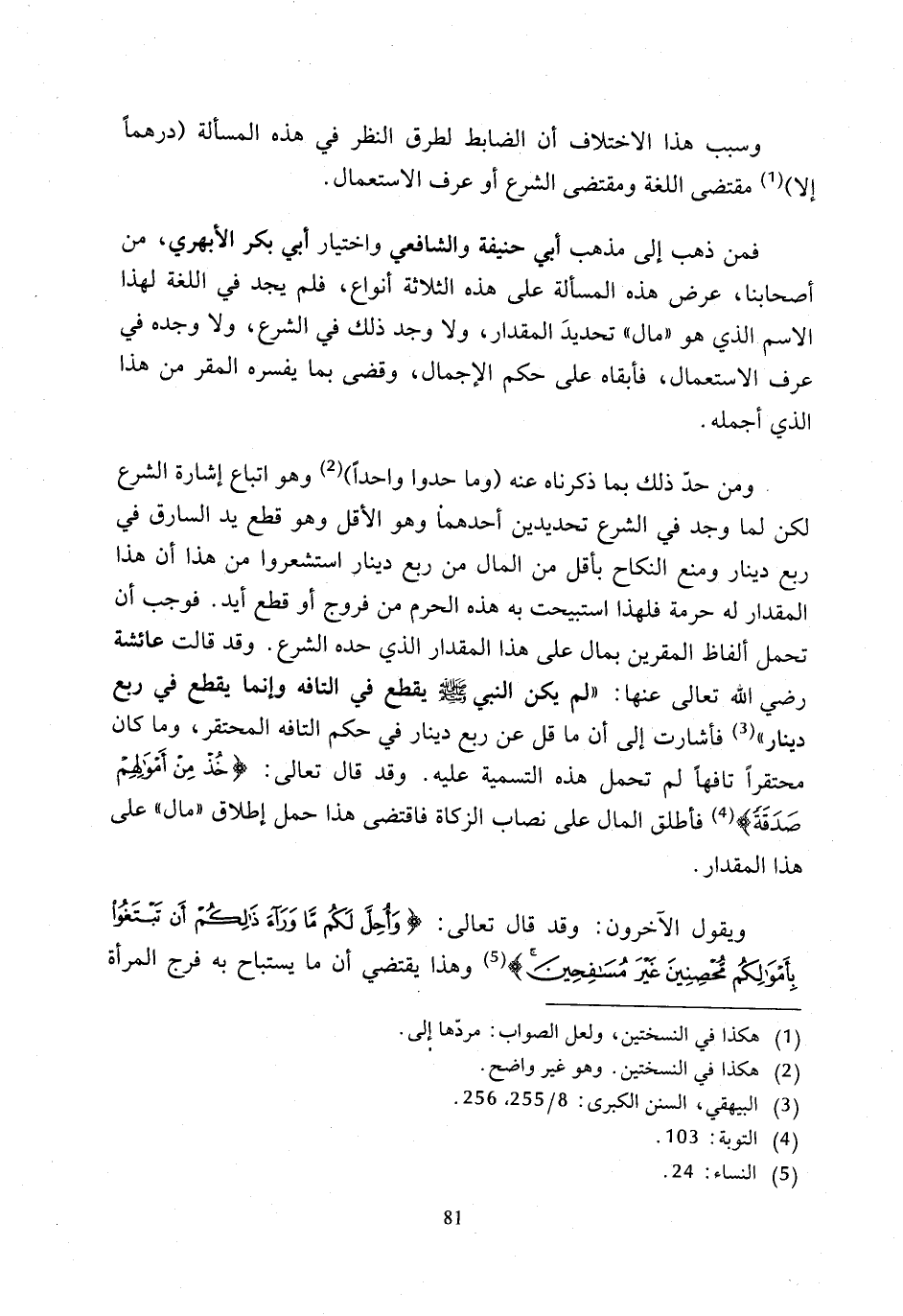 ومن حدّ ذلك بما ذكرناه عنه (وما حدوا واحدًا) (¬2) وهو اتباع إشارة الشرع لكن لما وجد في الشرع تحديدين أحدهمأوهو الأقل وهو قطع يد السارق في ربع دينار ومنع النكاح بأقل من المال من ربع دينار استشعروا من هذا أن هذا المقدار له حرمة فلهذا استبيحت به هذه الحرم من فروج أو قطع أيد. فوجب أن تحمل ألفاظ المقرين بمال على هذا المقدار الذي حده الشرع. وقد قالت عائشة رضي الله تعالى عنها: "لم يكن النبي - صلى الله عليه وسلم - يقطع في التافه وإنما يقطع في ربع دينار" (¬3) فأشارت إلى أن ما قل عن ربع دينار في حكم التافه المحتقر، وما كان محتقرًا تافهًا لم تحمل هذه التسمية عليه. وقد قال تعالى: {خُذْ مِنْ أَمْوَالِهِمْ صَدَقَةً} (¬4) فأطلق المال على نصاب الزكاة فاقتضى هذا حمل إطلاق "مال" على هذا المقدار.
