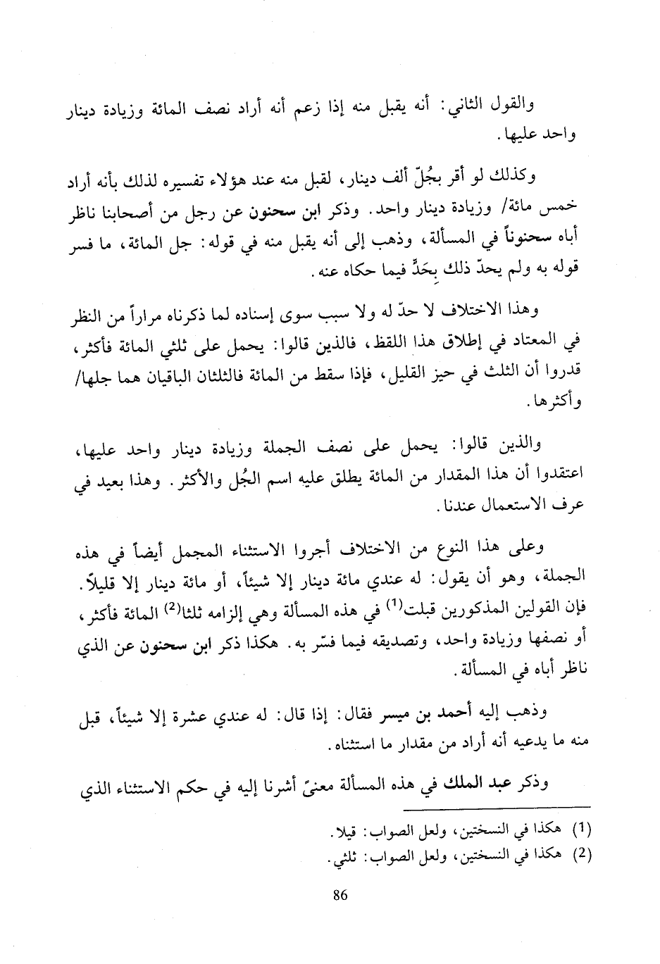 وكذلك لو أقر بجُلّ ألف دينار، لقبل منه عند هؤلاء تفسيره لذلك بأنه أراد خمس مائة وزيادة دينار واحد. وذكر ابن سحنون عن رجل من أصحابنا ناظر أباه سحنونًا في المسألة، وذهب إلى أنه يقبل منه في قوله: جل المائة، ما فسر قوله به ولم يحدّ ذلك بِحَذً فيما حكاه عنه.
