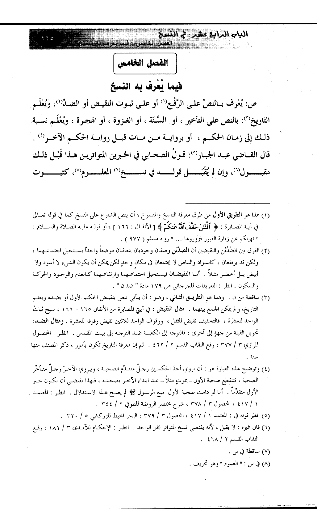 (¬3) ساقطة من ن. وهذا هو الطريق الثاني، وهو: أن يأتي نص بنقيض الحكم الأول أو بضده ويعلم التاريخ، ولم يمكن الجمع بينهما. مثال النقيض: في آيتي المصابرة من الأنفال 165 - 166، نسِخ ثباتُ الواحد للعشرة، فالتخفيف نقيض للثقل، ووقوف الواحد للاثنين نقيض وقوفه للعشرة. ومثال الضد: تحويل القبلة من جهةٍ إلى أخرى، فالتوجه إلى الكعبة ضد التوجه إلى بيت المقدس. انظر: المحصول للرازي 3 / 377، رفع النقاب القسم 2 / 462. ثم إن معرفة التاريخ تكون بأمور، ذكر المصنف منها ستة.