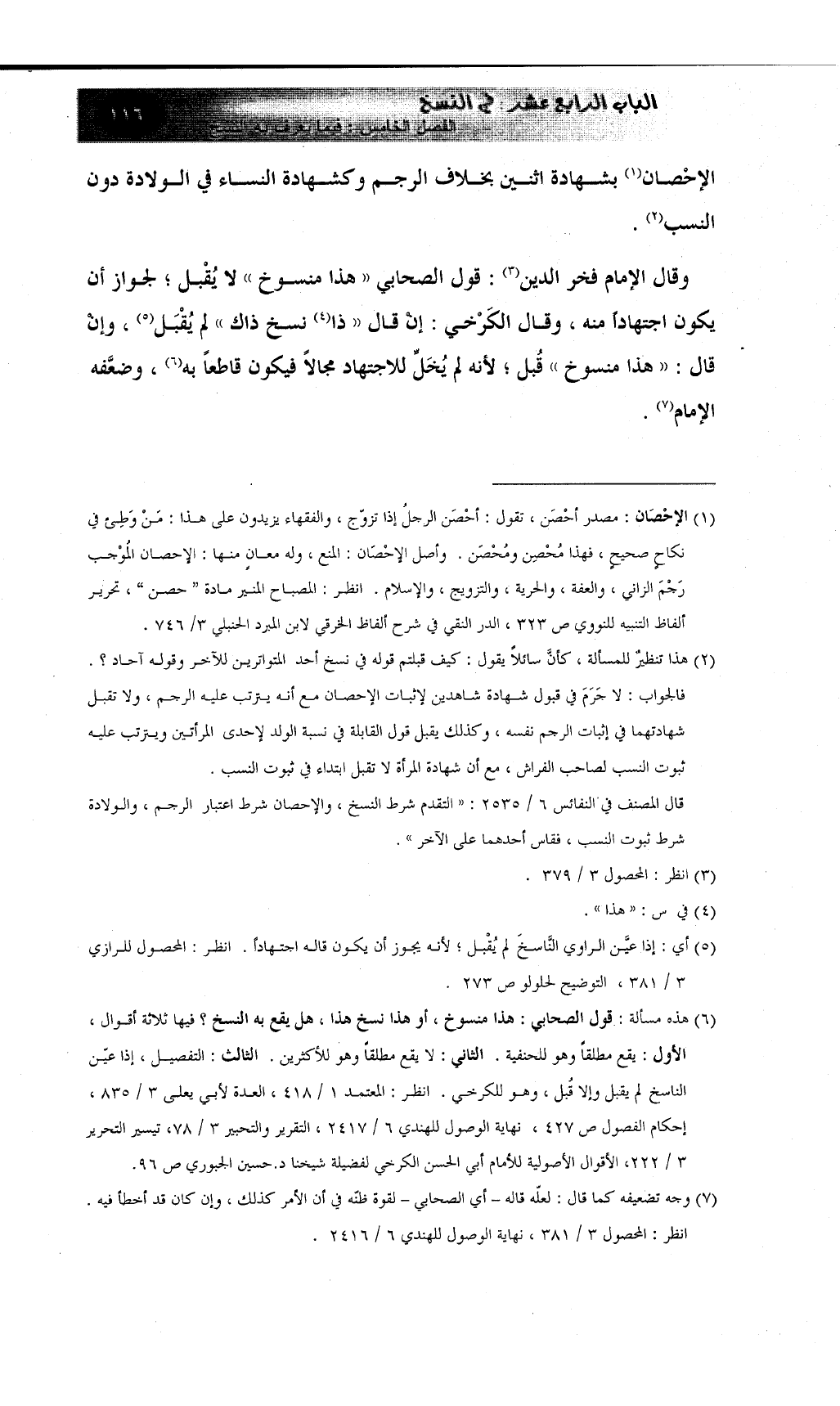 (¬2) هذا تنظيرٌ للمسألة، كأنَّ سائلاً يقول: كيف قبلتم قوله في نسخ أحد المتواترين للآخر وقوله آحاد؟ . فالجواب: لا جَرَمَ في قبول شهادة شاهدين لإثبات الإحصان مع أنه يترتب عليه الرجم، ولا تقبل شهادتهما في إثبات الرجم نفسه، وكذلك يقبل قول القابلة في نسبة الولد لإحدى المرأتين ويترتب عليه ثبوت النسب لصاحب الفراش، مع أن شهادة المرأة لا تقبل ابتداء في ثبوت النسب.