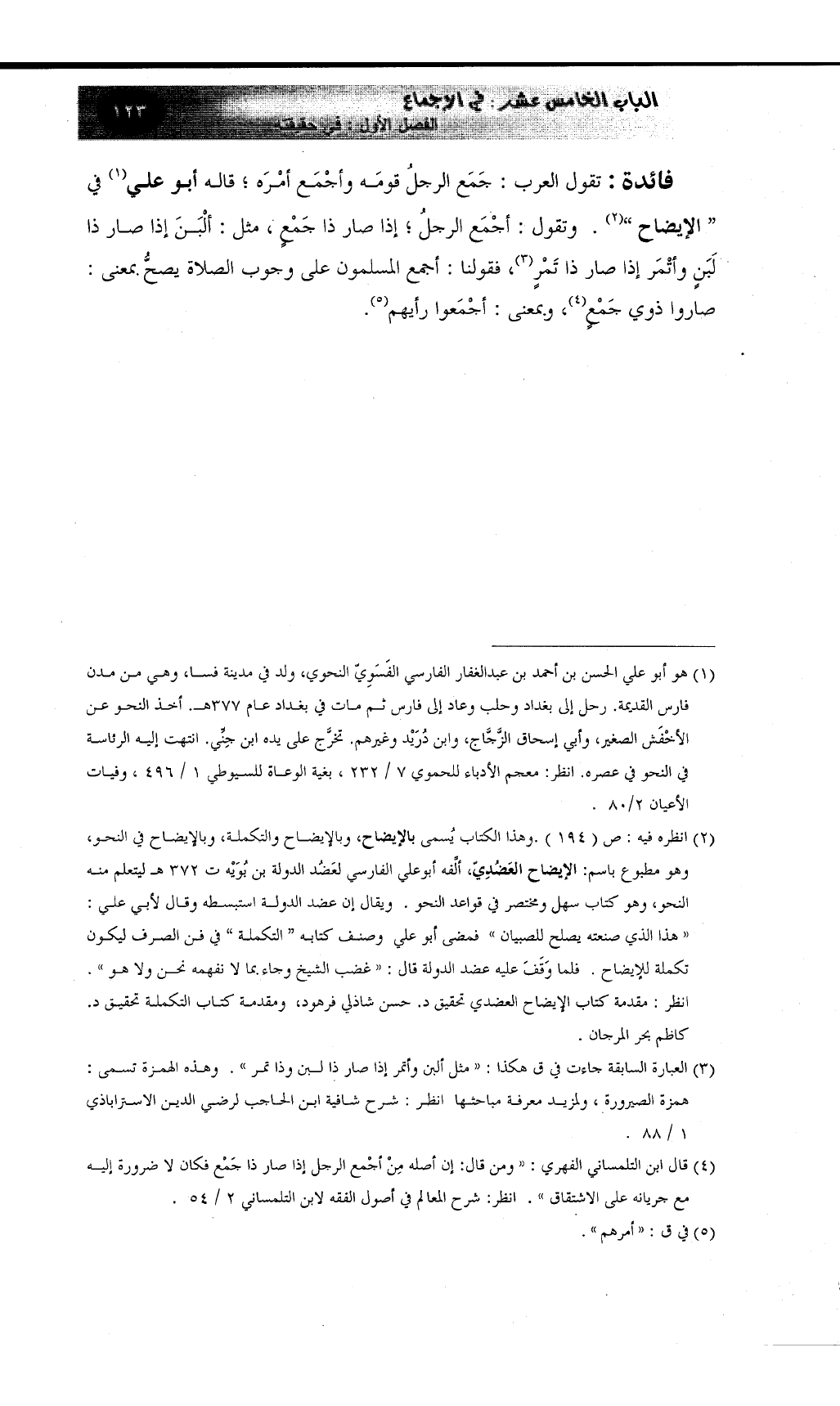 " الإيضاح " (¬2) . وتقول: أجْمَع الرجلُ؛ إذا صار ذا جَمْعٍ، مثل: ألْبَنَ إذا صار ذا لَبَنٍ وأتْمَر إذا صار ذا تَمْرٍ (¬3) ، فقولنا: أجمع المسلمون على وجوب الصلاة يصحُّ بمعنى: صاروا ذوي جَمْعٍ (¬4) ، وبمعنى: أجْمَعوا رأيهم (¬5) .