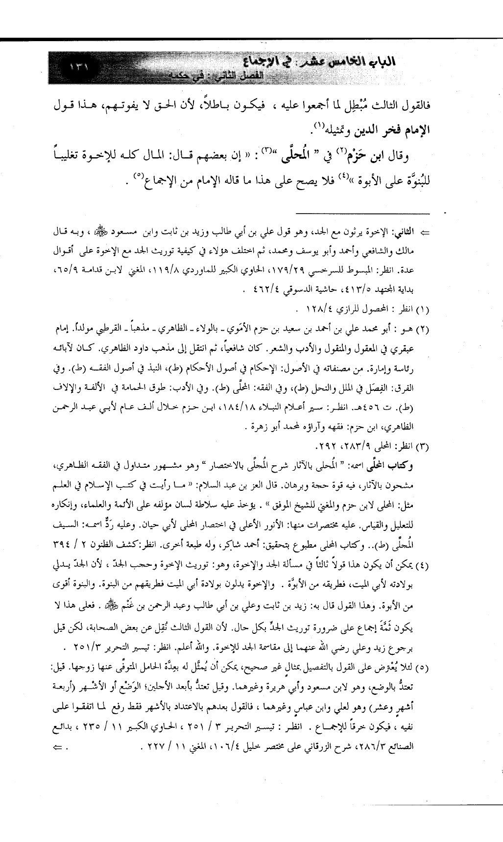 (¬4) يمكن أن يكون هذا قولاً ثالثاً في مسألة الجد والإخوة، وهو: توريث الإخوة وحجب الجدّ، لأن الجدّ يدلي بولادته لأبي الميت، فطريقه من الأبوَّة. والإخوة يدلون بولادة أبي الميت فطريقهم من البنوة. والبنوة أقوى من الأبوة. وهذا القول قال به: زيد بن ثابت وعلي بن أبي طالب وعبد الرحمن بن غَنْم رضي الله عنهم. فعلى هذا لا يكون ثَمَّةَ إجماع على ضرورة توريث الجدِّ بكل حال. لأن القول الثالث نُقِل عن بعض الصحابة، لكن قيل برجوع زيدٍ وعليٍ رضي الله عنهما إلى مقاسمة الجد للإخوة. والله أعلم. انظر: تيسير التحرير 3/251.