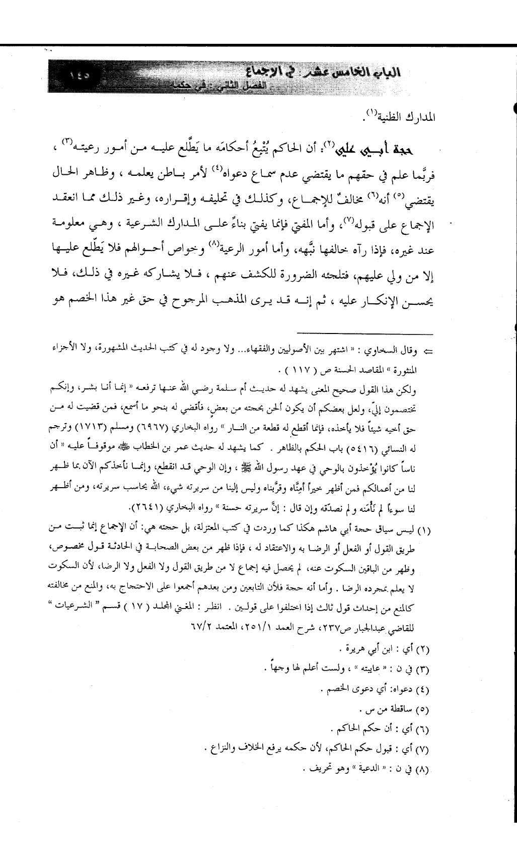 ) ليس سياق حجة أبي هاشم هكذا كما وردت في كتب المعتزلة، بل حجته هي: أن الإجماع إنما ثبت من طريق القول أو الفعل أو الرضا به والاعتقاد له، فإذا ظهر من بعض الصحابة في الحادثة قول مخصوص، وظهر من الباقين السكوت عنه، لم يحصل فيه إجماع لا من طريق القول ولا الفعل ولا الرضا، لأن السكوت لا يعلم بمجرده الرضا. وأما أنه حجة لأن التابعين ومن بعدهم أجمعوا على الاحتجاج به، والمنع من مخالفته كالمنع من إحداث قول ثالث إذا اختلفوا على قولين. انظر: المغني المجلد (17) قسم " الشرعيات " للقاضي عبد الجبار ص237، شرح العمد 1/251، المعتمد 2/67