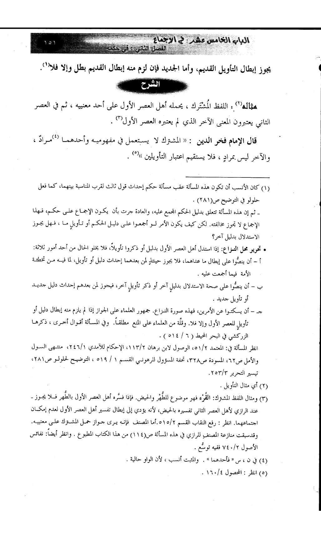 (¬3) ومثال اللفظ المشترك: القُرْء فهو موضوع للطُّهْر والحيض. فإذا فسَّره أهل العصر الأول بالطُّهر فلا يجوز ـ عند الرازي لأهل العصر الثاني تفسيره بالحيض، لأنه يؤدي إلى إبطال تفسير أهل العصر الأول لعدم إمكان اجتماعهما. انظر: رفع النقاب القسم 2/515.أما المصنف فإنه يرى جواز حمل المشترك على معنييه. وقدسبقت منازعة المصنفِ للرازي في هذه المسألة ص (114) من هذا الكتاب المطبوع. وانظر أيضاً: نفائس الأصول 2/740 ففيه توسُّع.