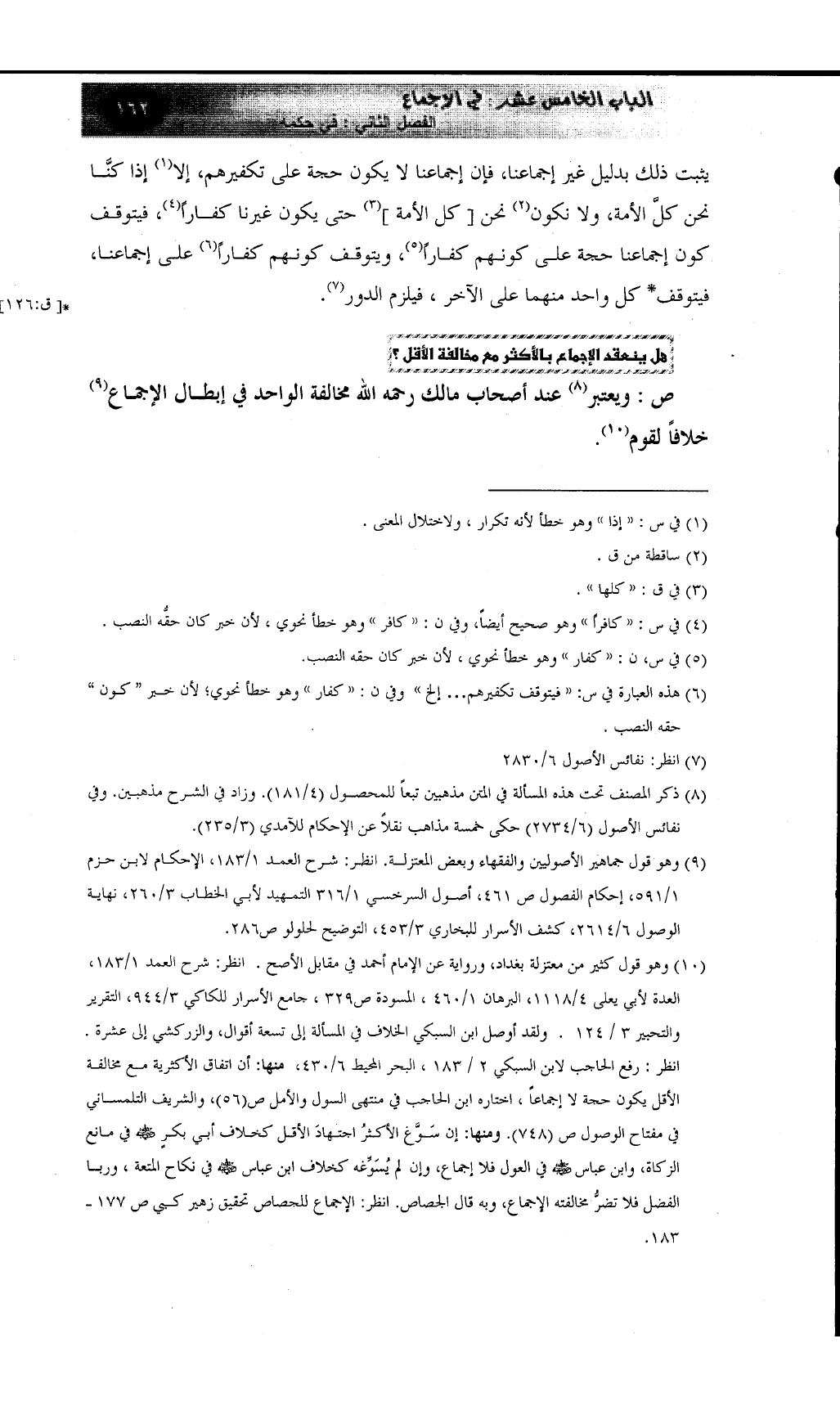(¬8) هذه المسألة عنوانها: هل ينعقد الإجماع بالأكثر مع مخالفة الأقل؟. ذكر المصنف في المتن مذهبين تبعا للمحصول (4/181) . وزاد في الشرح مذهبين. وفي نفائس الأصول (6/2734) حكى خمسة مذاهب نقلاً عن الإحكام للآمدي (3/235) .
