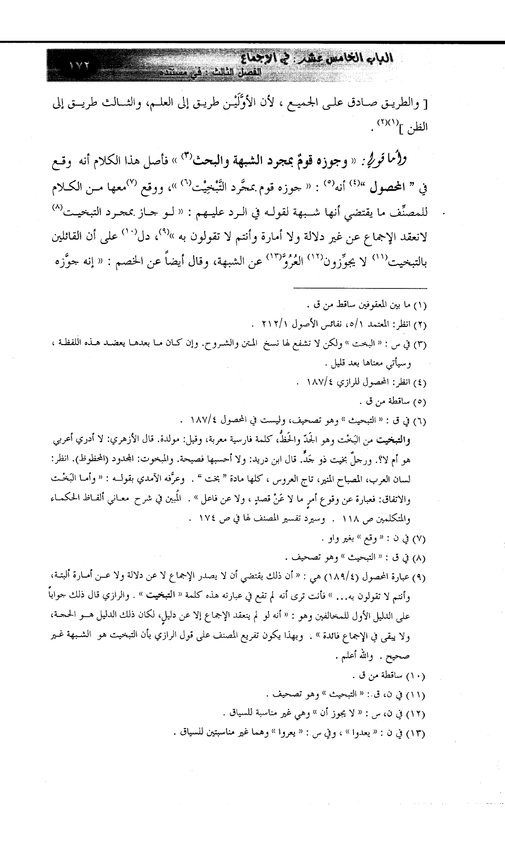 (¬9) عبارة المحصول (4/189) هي: ((أن ذلك يقتضي أن لا يصدر الإجماع لا عن دلالة ولا عن أمارة ألبتة، وأنتم لا تقولون به ... )) فأنت ترى أنه لم تقع في عبارته هذه كلمة ((التبخيت)) . والرازي قال ذلك جواباً على الدليل الأول للمخالفين وهو: ((أنه لو لم ينعقد الإجماع إلا عن دليلٍ، لكان ذلك الدليل هو الحجة، ولا يبقى في الإجماع فائدة)) . وبهذا يكون تفريع المصنف على قول الرازي بأن التبخيت هو الشبهة غير صحيح. والله أعلم.