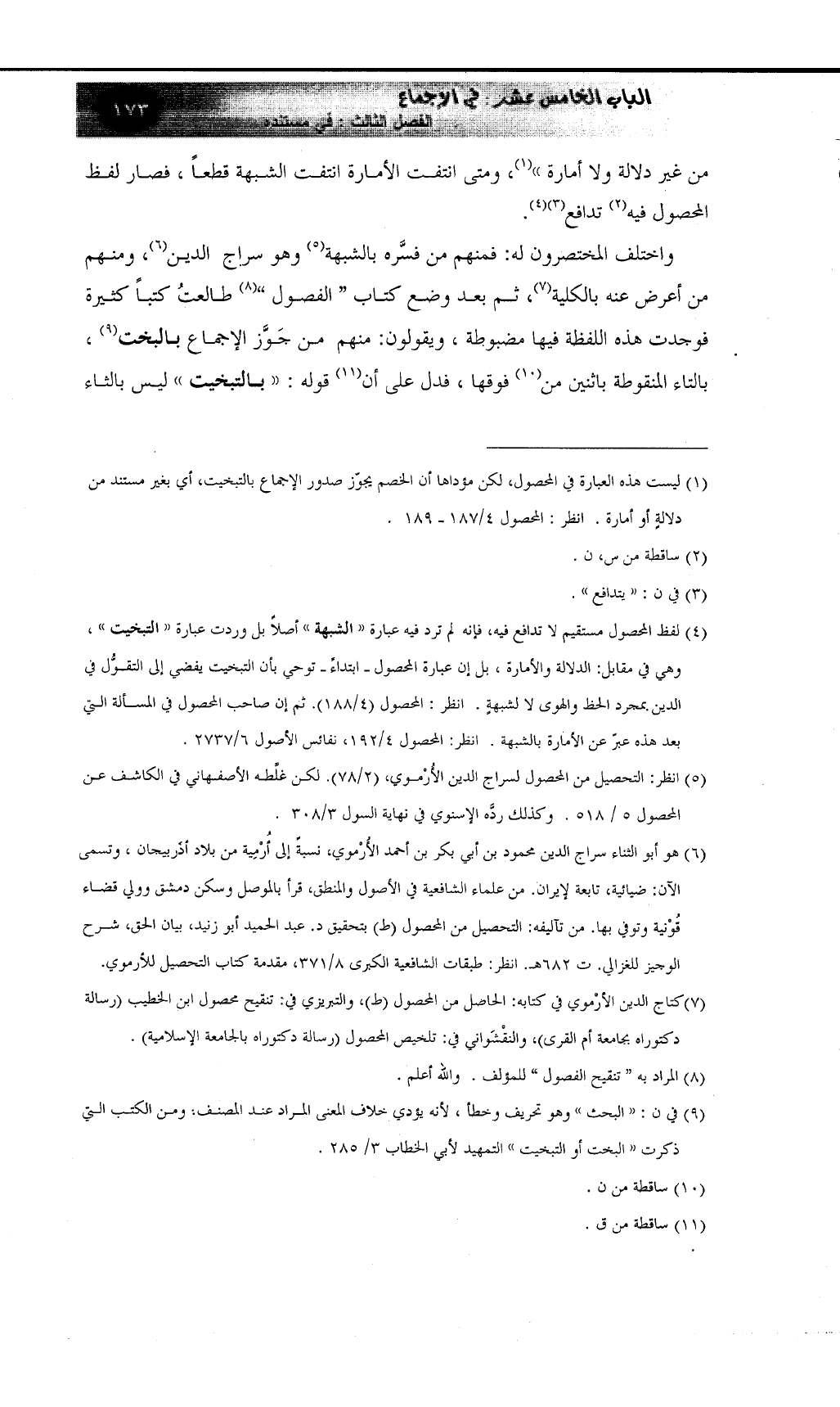 (¬1) ليست هذه العبارة في المحصول، لكن مؤداها أن الخصم يجوّز صدور الإجماع بالتبخيت، أي بغير مستند من دلالةٍ أو أمارة. انظر المحصول 4/187 ـ 189.