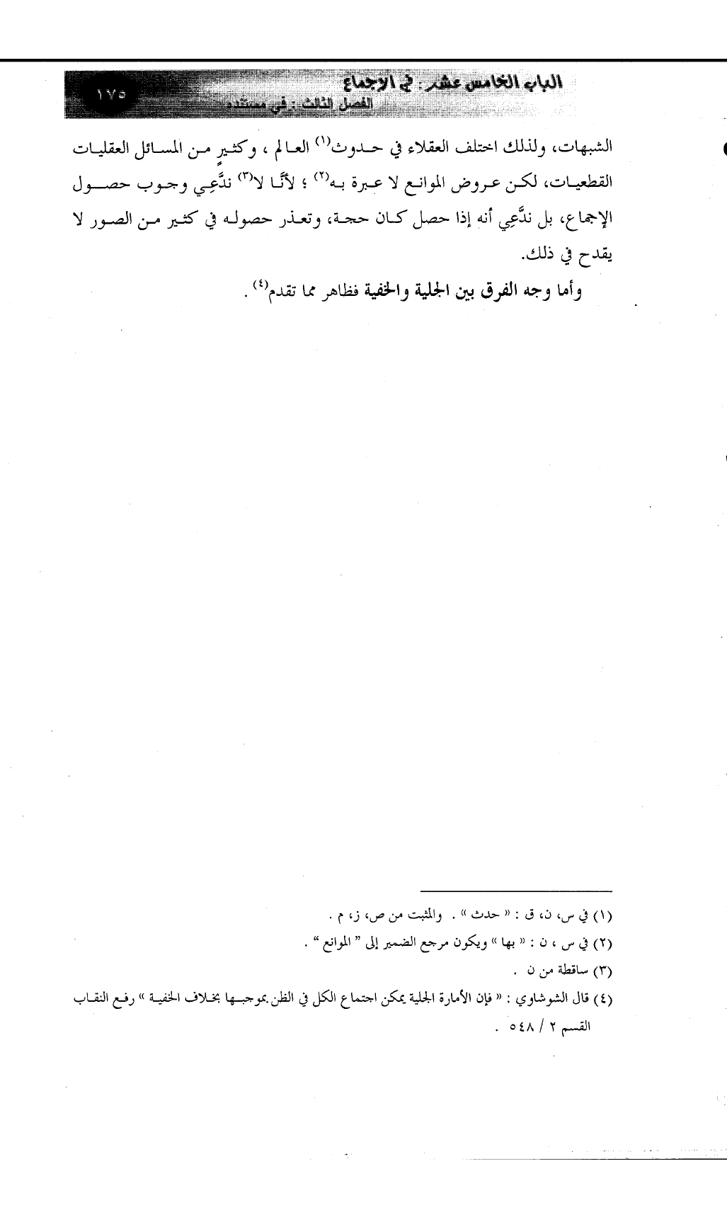 (¬4) قال الشوشاوي: ((فإن الأمارة الجلية يمكن اجتماع الكل في الظن بموجبها بخلاف الخفية)) رفع النقاب القسم 2 / 548.