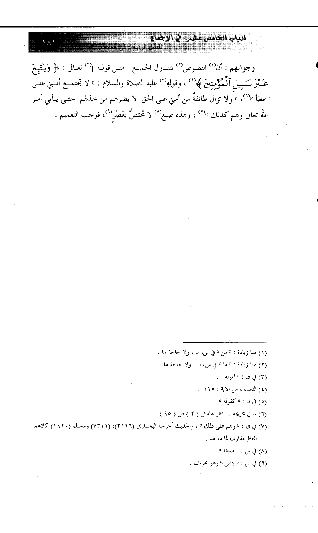 وجوابهم: أن (¬1) النصوص (¬2) تتناول الجميع [مثل قوله] (¬3) تعالى: {وَيَتَّبِعْ غَيْرَ سَبِيلِ الْمُؤْمِنِينَ} (¬4) ، وقولِهِ (¬5) عليه الصلاة والسلام: ((لا تجتمع أمتي على خطأ)) (¬6) ، ((ولا تزال طائفةٌ من أمتي على الحق لا يضرهم من خذلهم حتى يأتي أمر الله تعالى وهم كذلك)) (¬7) ، وهذه صيغ (¬8) لا تختصُّ بعَصْرٍ (¬9) ، فوجب التعميم.