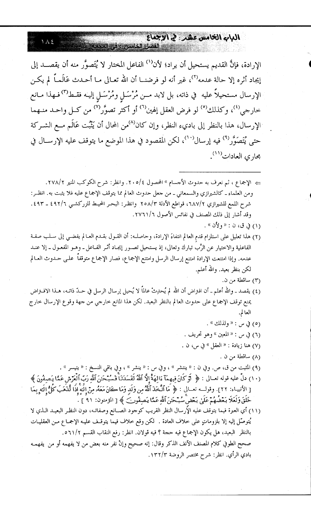 (¬4) يقصد ـ والله أعلم ـ أن افتراض أن الله لم يُحدِثْ عالماً لا يُحيل إرسال الرسل في حدّ ذاته، هذا الافتراض يمنع توقف الإجماع على حدوث العالم بالنظر البعيد. لكن هذا المانع خارجي من جهة وقوع الإرسال خارج العالم.