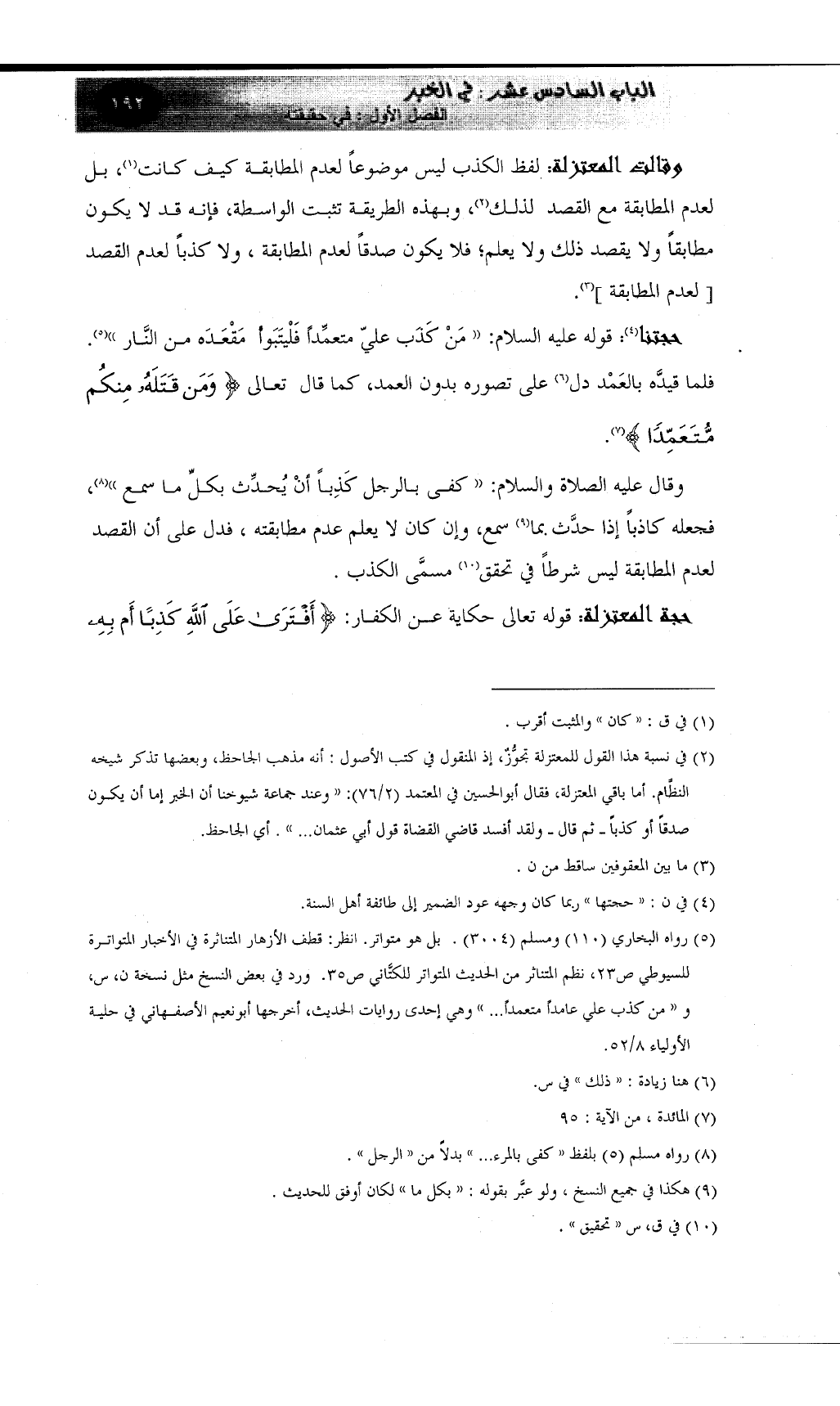 (¬6) رواه البخاري (110) ومسلم (3004) . بل هو متواتر. انظر: قطف الأزهار المتناثرة في الأخبار المتواترة للسيوطي ص23، نظم المتناثر من الحديث المتواتر للكتَّاني ص35. ورد في بعض النسخ مثل نسخة ن، س، و "من كذب علي عامداً متعمداً ... " وهي إحدى روايات الحديث، أخرجها أبونعيم الأصفهاني في حلية الأولياء 8/52.