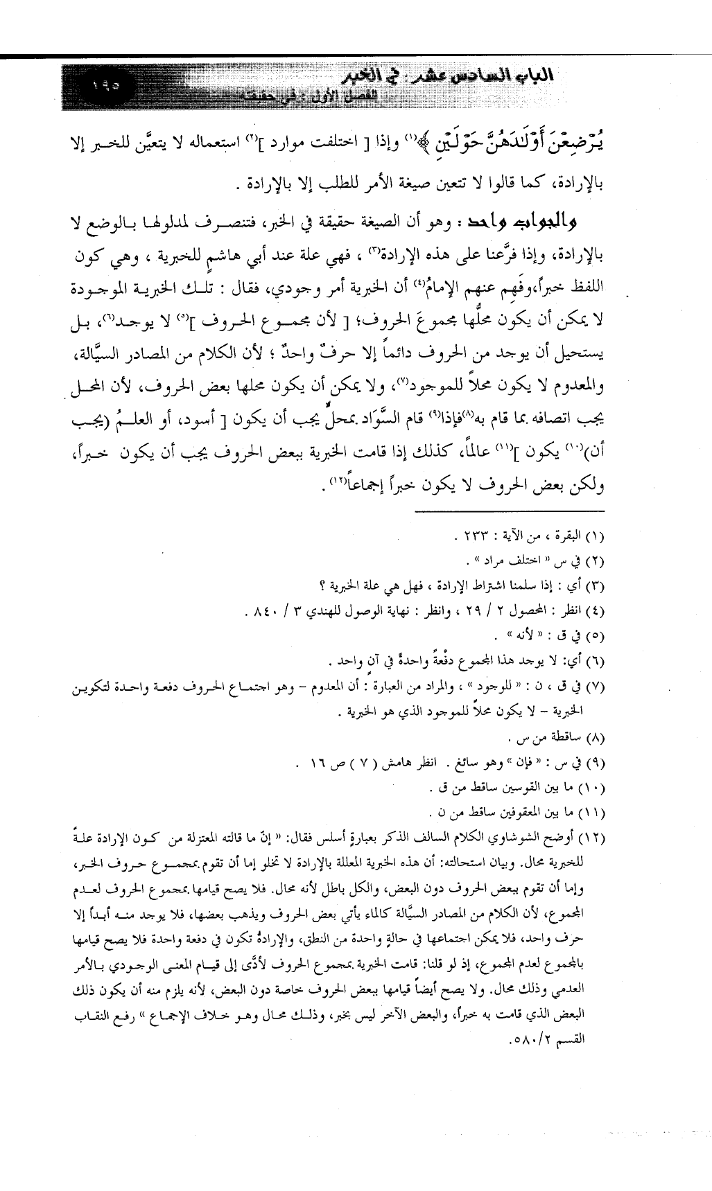 (¬12) أوضح الشوشاوي الكلام السالف الذكر بعبارةٍ أسلس فقال: "إنّ ما قالته المعتزلة من كون الإرادة علةً للخبرية محال. وبيان استحالته: أن هذه الخبرية المعللة بالإرادة لا تخلو إما أن تقوم بمجموع حروف الخبر، وإما أن تقوم ببعض الحروف دون البعض، والكل باطل لأنه محال..فلا يصح قيامها بمجموع الحروف لعدم المجموع، لأن الكلام من المصادر السيَّالة كالماء يأتي بعض الحروف ويذهب بعضها، فلا يوجد منه أبداً إلا حرف واحد، فلا يمكن اجتماعها في حالةٍ واحدة من النطق، والإرادةُ تكون في دفعة واحدة فلا يصح قيامها بالمجموع لعدم المجموع، إذْ لو قلنا: قامت الخبرية بمجموع الحروف لأدَّى إلى قيام المعنى الوجودي بالأمر العدمي وذلك محال. ولا يصح أيضاً قيامها ببعض الحروف خاصة دون البعض، لأنه يلزم منه أن يكون ذلك البعض الذي قامت به خبراً، والبعض الآخر ليس بخبر، وذلك محال وهو خلال الإجماع" رفع النقاب القسم 2/580.