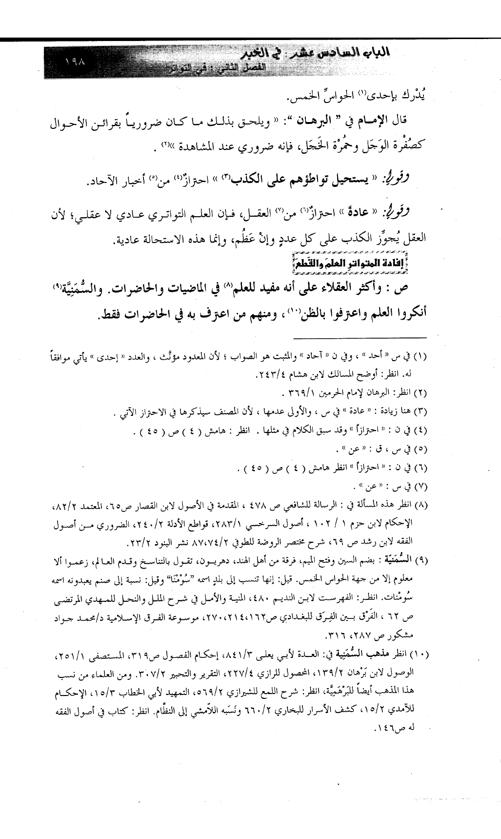 وأكثر العقلاء على أنه مفيد للعلم (¬8) في الماضيات والحاضرات. والسُّمَنِيَّة (¬9) أنكروا العلم واعترفوا بالظن (¬10) ، ومنهم من اعترف به في الحاضرات فقط.