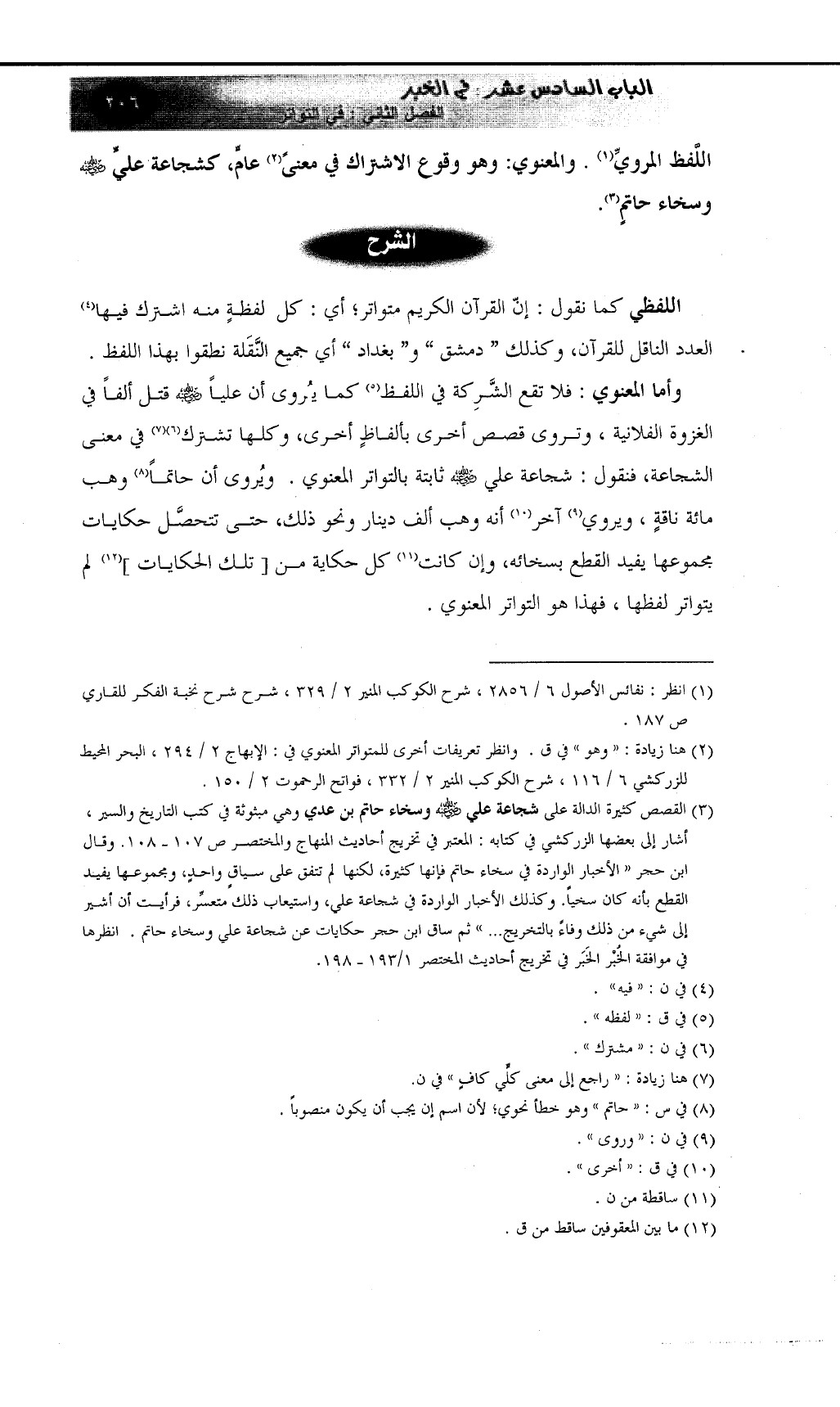 اللَّفظ المرويِّ (¬1) . والمعنوي: وهو وقوع الاشتراك في معنىً (¬2) عامٍّ؛ كشجاعة عليٍّ رضي الله عنه وسخاء حاتمٍ (¬3) .