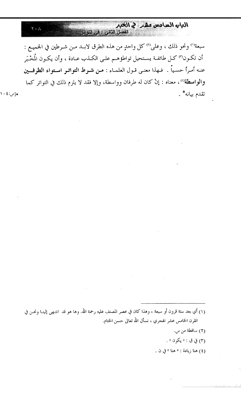 سبعة (¬1) ونحو ذلك، وعلى (¬2) كل واحدٍ من هذه الطرق لابد من شرطين في الجميع: أن تكون (¬3) كل طائفة يستحيل تواطؤهم على الكذب عادة، وأن يكون المُخْبَر عنه أمراً حسياً. فهذا معنى قول العلماء: من شرط التواتر استواء الطرفين والواسطة (¬4) ، معناه: إنْ كان له طرفان وواسطة، وإلا فقد لا يلزم ذلك في التواتر كما تقدم بيانه*.