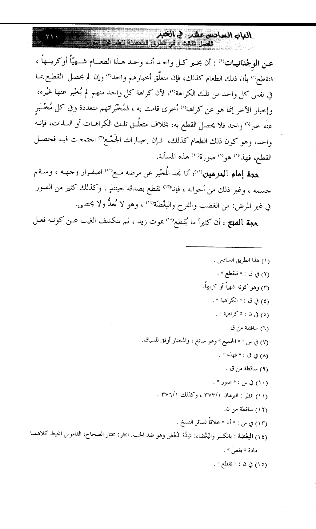 عن الوِجْدَانيات (¬1) أن يخبر كل واحد أنه وجد هذا الطعام شهيّاً أوكريهاً، فنقطع (¬2) بأن ذلك الطعام كذلك، فإن متعلَّق أخبارهم واحد (¬3) وإن لم يحصل القطع بما في نفس كل واحد من تلك الكراهة (¬4) ، لأن كراهة كل واحد منهم لم يُخْبِر عنها غيُره وإخبار الآخر إنما هو عن كراهة (¬5) أخرى قامت به فمُخْبَراتهم (¬6) متعددة وفي كل مُخْبَرٍ عنه خبر (¬7) واحد فلا يحصل القطع به، بخلاف متعلَّق تلك الكراهات أو اللذات، فإنه واحد، وهو كون ذلك الطعام كذلك، فإن إخبارات الجَمْع (¬8) اجتمعت فيه فحصل القطع، فهذا (¬9) هو (¬10)