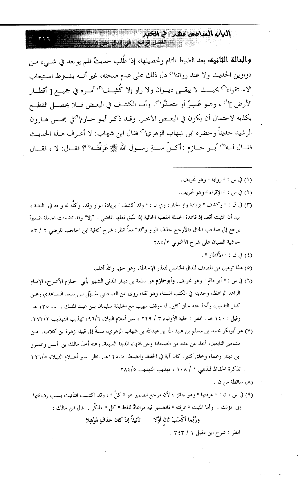 والحالة الثانية: بعد الضبط التام وتحصيلها، إذا طُلب حديثٌ فلم يوجد في شيء من دواوين الحديث ولا عند رواته (¬1) دل ذلك على عدم صحته، غير أنه يشترط استيعاب الاستقراء (¬2) بحيث لا يبقى ديوان ولا راوٍ إلا (¬3) كُشِف (¬4) أمره في جميع [أقطار الأرض] (¬5) ، وهو عَسِرٌ أو متعذِّر (¬6) . وأما الكشف في البعض فلا يحصل القطع بكذبه لاحتمال أن يكون في البعض الآخر. وقد ذكر أبو حازم (¬7) في مجلس هارون الرشيد حديثاً وحضره ابن شهاب الزهري (¬8)