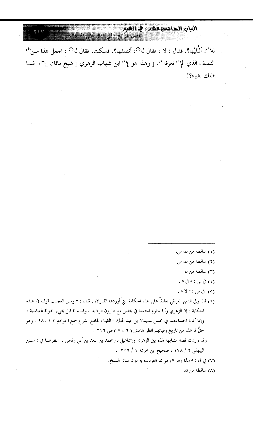 (¬6) نقل حلولو في التوضيح شرح التنقيح ص (305) عن العراقي اعتراضه على القرافي في إيراد هذه القصة، قال: إنهما ماتا قبل مجيء الدولة العباسية، وإنما كان اجتماعهما في مجلس سليمان بن عبد الملك". وهو حقٌّ لما علم من تاريخ وفياتهم.