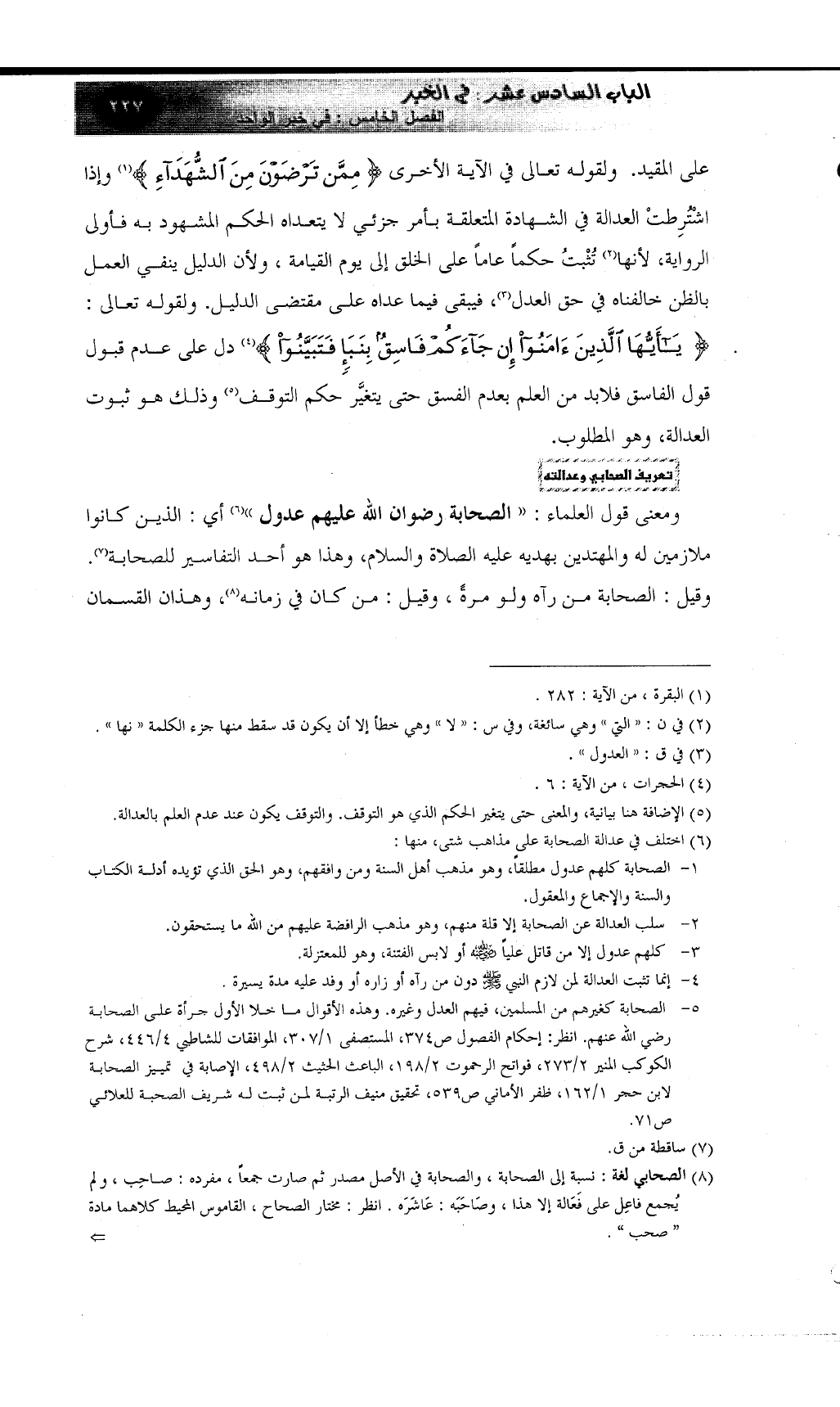 1- ... الصحابة كلهم عدول مطلقاً، وهو مذهب أهل السنة ومن وافقهم، وهو الحق الذي تؤيده أدلة الكتاب والسنة والإجماع والمعقول.