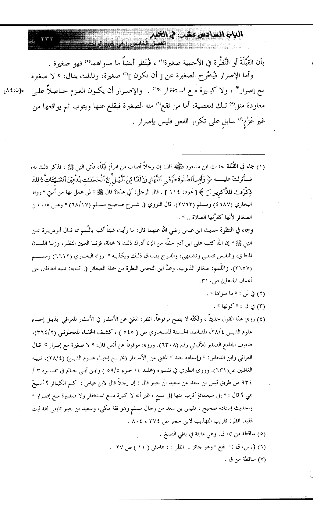 (¬1) جاء في القُبْلة حديث ابن مسعود رضي الله عنه قال: إن رجلاً أصاب من امرأةٍ قُبْلةً، فأتى النبي صلى الله عليه وسلم، فذكر ذلك له، فأُنزلتْ عليه {أقم الصلاة طرفي النهار وزلفاً من الليل إن الحسنات يذهب السيئات ذلك ذكرى للذاكرين} [هود: 114] . قال الرجل: ألي هذه؟ قال صلى الله عليه وسلم "لمن عمل بها من أمتي" رواه البخاري (4687) ومسلم (2763) . قال النووي في شرح صحيح مسلم (17/68) "وهي هنا من الصغائر لأنها كفرَّتها الصلاة ... ".