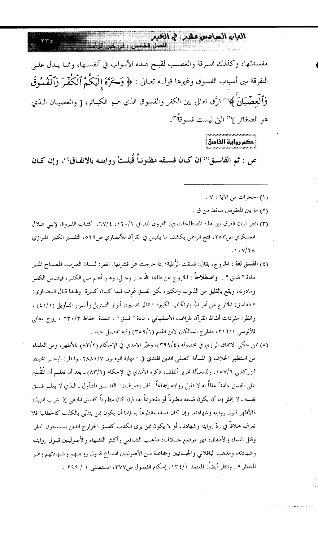 (¬5) ممن حكى الاتفاق الرازي في محصوله (4/399) ، وعبَّر الآمدي في الإحكام (2/83) بالأظهر، ومن العلماء من استظهر الخلاف في المسألة كصفي الدين الهندي في: نهاية الوصول 7/2881، وانظر: البحر المحيط للزركشي 6/157. وللمسألة تحرير ألطف، ذكره الآمدي في الإحكام (2/83) ـ بعد أن نعلم أن المُقْدِم على الفسق عامداً عالماً به لا تقبل روايته إجماعاً ـ قال بتصرف: "الفاسق المتأول ـ الذي لا يعلم فسق نفسه ـ لا يخلو إما أن يكون فسفه مظنوناً أو مقطوعاً به، فإن كان مظنوناً كفسق الحنفي إذ شرب النبيذ، فالأظهر قبول روايته وشهادته. وإن كان فسقه مقطوعاً به فإما أن يكون ممن يتديّن بالكذب كالخطابية فلا نعرف خلافاً في ردّ روايته وشهادته، أو لا يكون ممن يرى الكذب كفسق الخوارج الذين يستبيحون الدار وقتل النساء والأطفال، فهو موضع خلاف، مذهب الشافعي وأكثر الفقهاء والأصوليين قبول روايته وشهادته، ومذهب الباقلاني والجبائيين وجماعة من الأصوليين امتناع قبول روايتهم وشهادتهم وهو المختار". وانظر أيضاً: المعتمد 1/134، إحكام الفصول ص377، المستصفى 1 / 299.