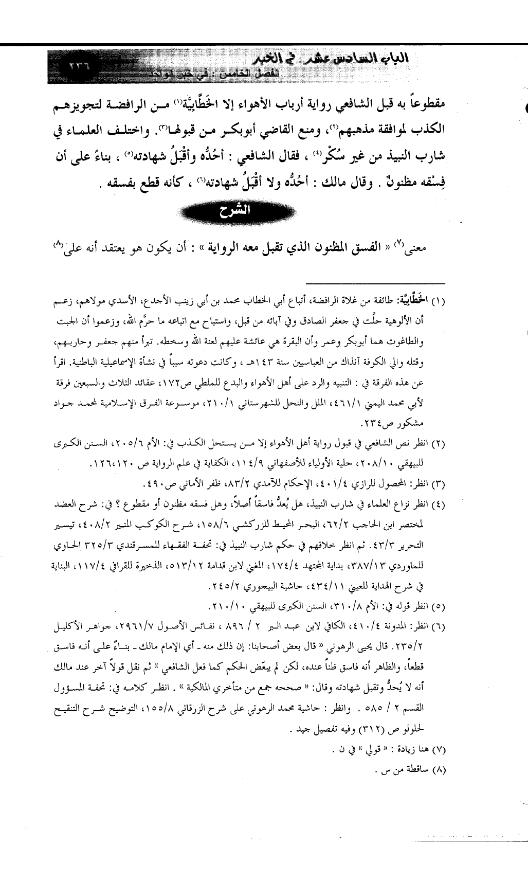 (¬4) انظر نزاع العلماء في شارب النبيذ، هل يُعدُّ فاسقاً أصلاً، وهل فسقه مظنون أم مقطوع؟ في: شرح العضد لمختصر ابن الحاجب 2/62، البحر المحيط للزركشي 6/158، شرح الكوكب المنير 2/408، تيسير التحرير 3/43. ثم انظر خلافهم في حكم شارب النبيذ في: تحفة الفقهاء للمسرقندي 3/325 الحاوي للماوردي 13/387، بداية المجتهد 4/174، المغني لابن قدامة 12/513، الذخيرة للقرافي 4/117، البناية في شرح الهداية للعيني 11/434، حاشية البيجوري 2/245.