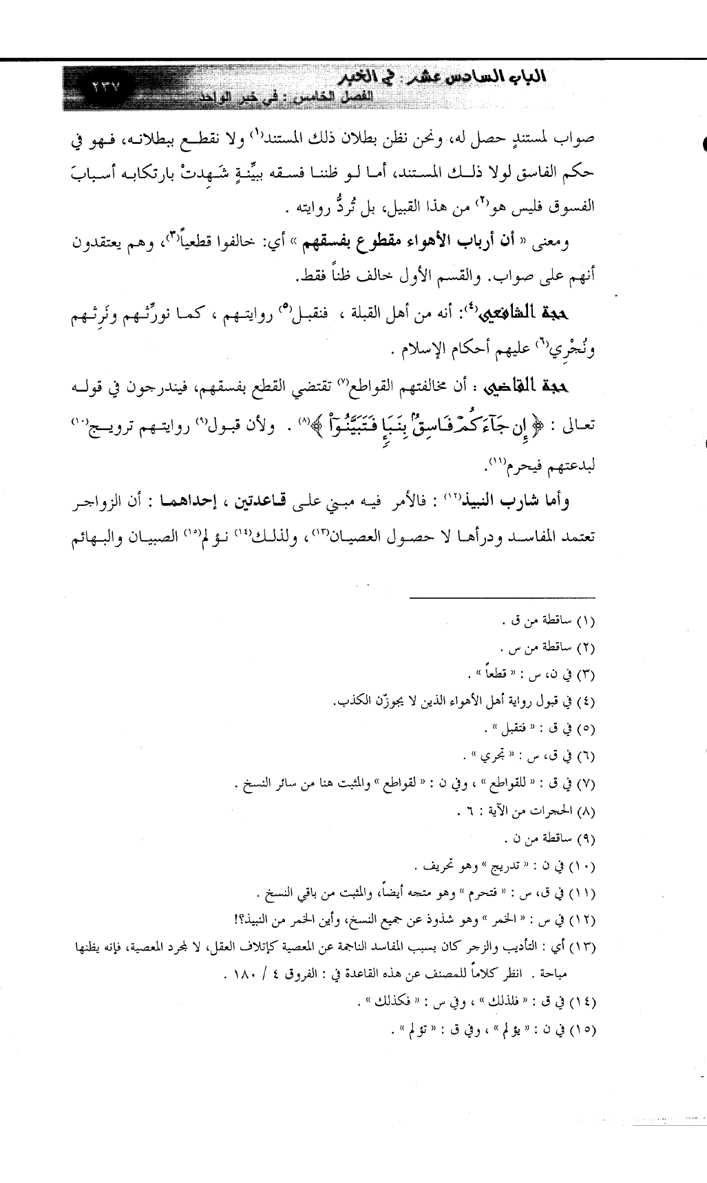 حجة القاضي: أن مخالفتهم القواطع (¬7) تقتضي القطع بفسقهم، فيندرجون في قوله تعالى: {إن جاءكم فاسق بنبأ فتبينوا} (¬8) . ولأن قبول (¬9) روايتهم ترويج (¬10) لبدعتهم فيحرم (¬11) .