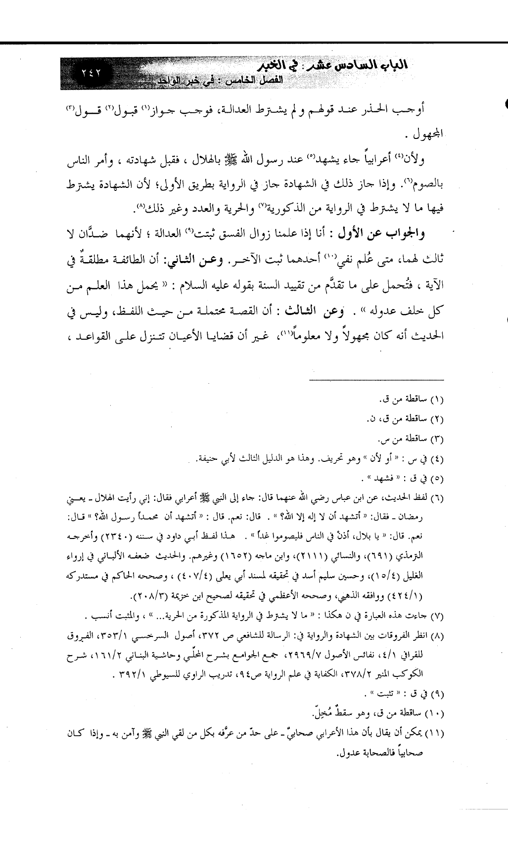 (¬8) انظر الفروقات بين الشهادة والرواية في: الرسالة للشافعي ص 372، أصول السرخسي 1/353، الفروق للقرافي 1/4، نفائس الأصول 7/2969، جمع الجوامع شرح المحلي بحاشية البناني 2/161، شرح الكوكب المنير 2/378، الكفاية في علم الرواية ص94، تدريب الراوي للسيوطي 1/392.