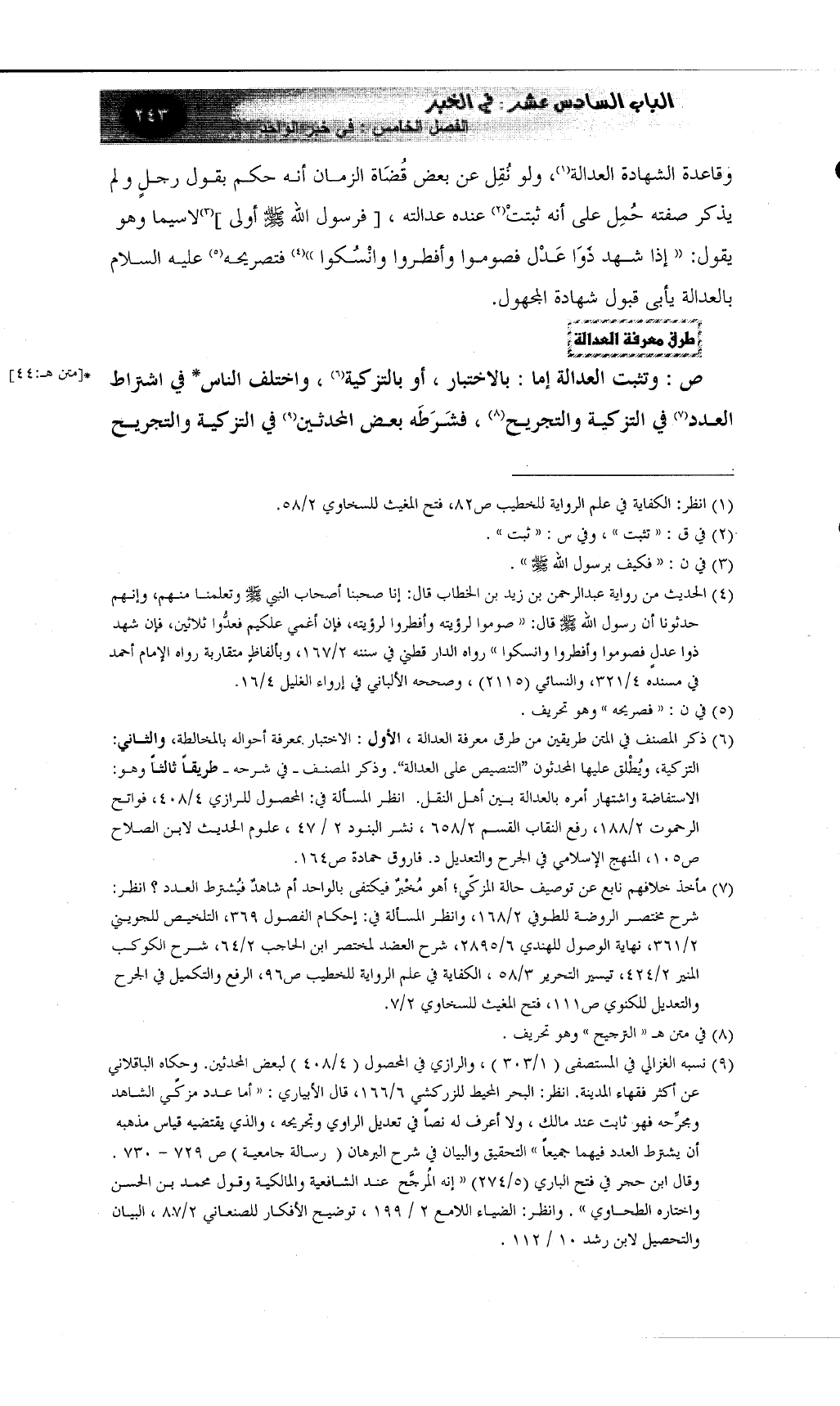 (¬9) نسبه الغزالي في المستصفى (1/303) ، والرازي في المحصول (4/408) لبعض المحدثين. وحكاه الباقلاني عن أكثر فقهاء المدينة. انظر: البحر المحيط للزركشي 6/166، قال الأبياري: ((أما عدد مزكِّي الشاهد ومجرِّحه فهو ثابت عند مالك، ولا أعرف له نصاً في تعديل الراوي وتخريجه، والذي يقتضيه قياس مذهبه أن يشترط العدد فيهما جميعاً)) التحقيق والبيان في شرح البرهان (رسالة جامعية) ص 729 - 730. وقال ابن حجر في فتح الباري (5/274) "إنه المُرجَّح عند الشافعية والمالكية وقول محمد بن الحسن واختاره الطحاوي"..وانظر: الضياء اللامع 2 / 199، توضيح الأفكار للصنعاني 2/87، البيان والتحصيل لابن رشد 10 / 112.