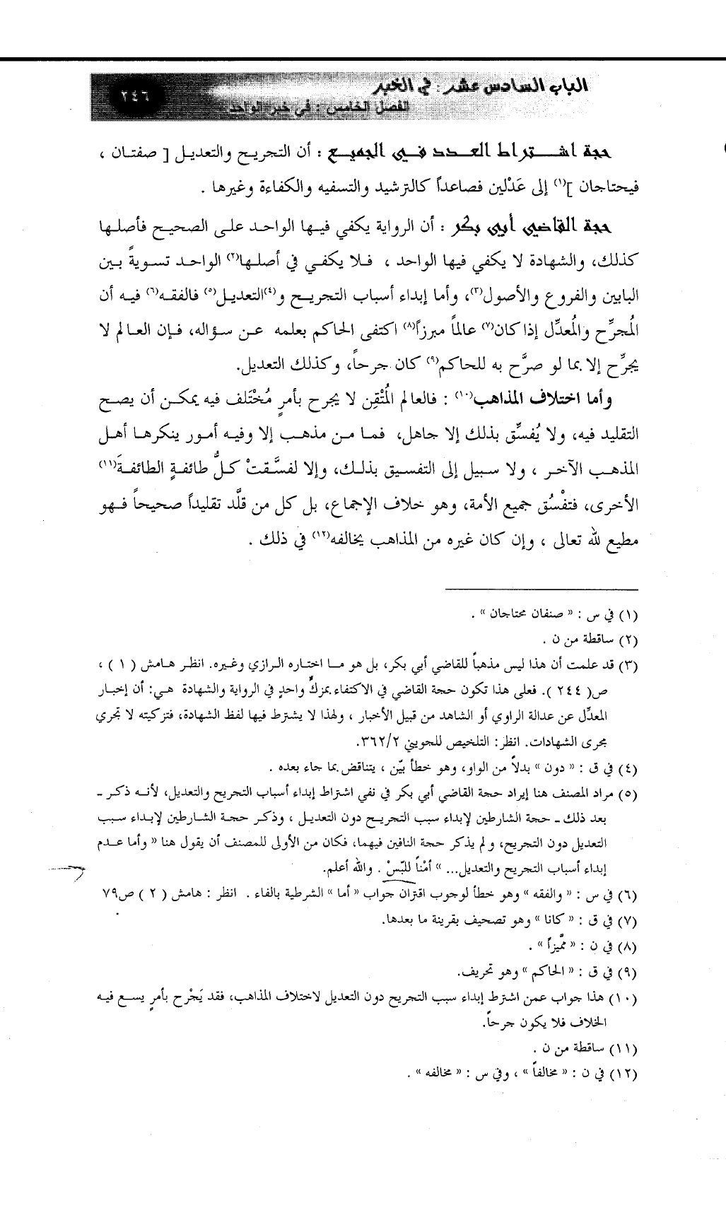 (¬3) قد علمت أن هذا ليس مذهباً للقاضي أبي بكر، بل هو ما اختاره الرازي وغيره. فعلى هذا تكون حجة القاضي في الاكتفاء بمزكٍّ واحدٍ في الرواية والشهادة هي: أن إخبار المعدِّل عن عدالة الراوي أو الشاهد من قبيل الأخبار، ولهذا لا يشترط فيها لفظ الشهادة، فتزكيته لا تجري مجرى الشهادات. انظر: التلخيص للجويني 2/362.
