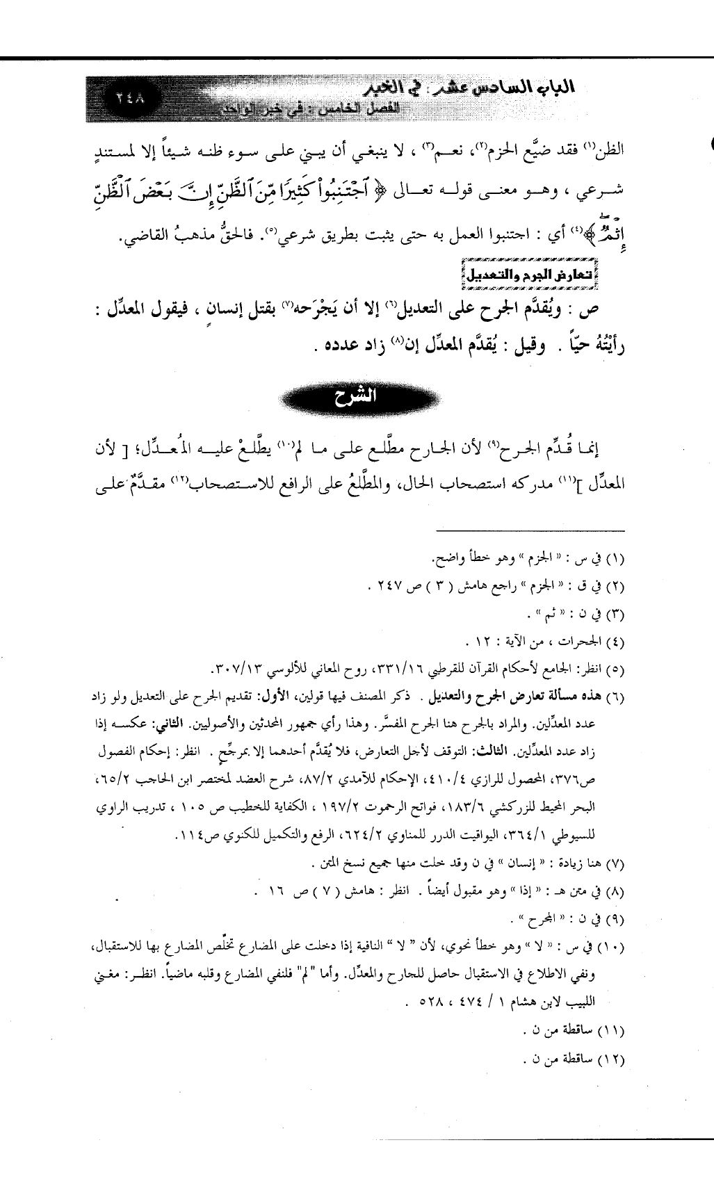 (¬6) هذه مسألة تعارض الجرح والتعديل. ذكر المصنف فيها قولين؛ الأول: تقديم الجرح على التعديل ولو زاد عدد المعدِّلين. والمراد بالجرح هنا الجرح المفسَّر. وهذا رأي جمهور المحدثين والأصوليين. الثاني: عكسه إذا زاد عدد المعدِّلين. الثالث: التوقف لأجل التعارض، فلا يُقدَّم أحدهما إلا بمرجِّحٍ. انظر: إحكام الفصول ص376، المحصول للرازي 4/410، الإحكام للآمدي 2/87، شرح العضد لمختصر ابن الحاجب 2/65، البحر المحيط للزركشي 6/183، فواتح الرحموت 2/197، الكفاية للخطيب ص 105، تدريب الراوي للسيوطي 1/364، اليواقيت الدرر للمناوي 2/624، الرفع والتكميل للكنوي ص114.