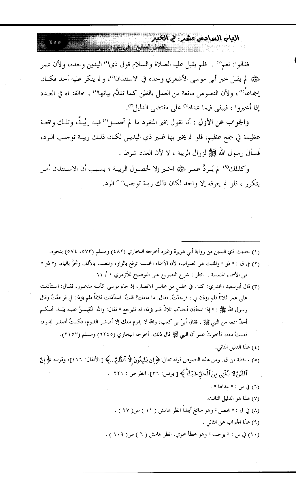 والجواب عن الأول: أنا نقول بخبر المنفرد ما لم تحصل (¬8) فيه رِيْبةٌ وتلك واقعة عظيمة في جمع عظيم فلو لم يخبر بها غير ذي اليدين لكان ذلك ريبة توجب الرد، فسأل رسول الله صلى الله عليه وسلم لزوال الريبة، لا لأن العدد شرط.
