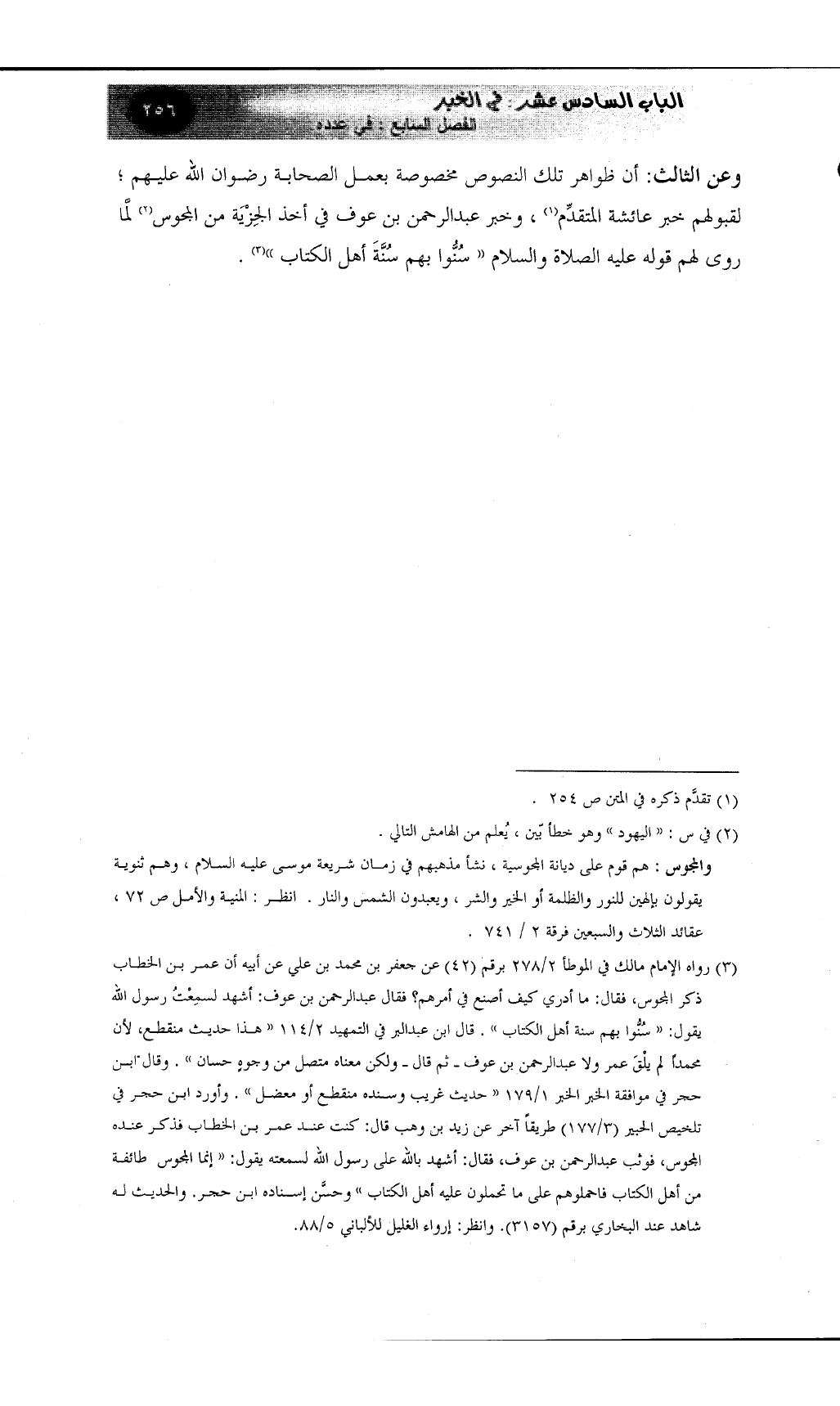 (¬2) رواه الإمام مالك في الموطأ 2/278 برقم (42) عن جعفر بن محمد بن علي عن أبيه أن عمر بن الخطاب ذكر المجوس، فقال: ما أدري كيف أصنع في أمرهم؟ فقال عبد الرحمن بن عوف: أشهد لسمِعْتُ رسول الله يقول: "سُنُّوا بهم سنة أهل الكتاب". قال ابن عبد البر في التمهيد 2/114 "هذا حديث منقطع، لأن محمداً لم يلْقَ عمر ولا عبد الرحمن بن عوف ـ ثم قال ـ ولكن معناه متصل من وجوهٍ حسان". وقال ابن حجر في موافقة الخبر الخبر 1/179 "حديث غريب وسنده منقطع أو معضل". وأورد ابن حجر في تلخيص الحبير (3/177) طريقاً آخر عن زيد بن وهب قال: كنت عند عمر بن الخطاب فذكر عنده المجوس، فوثب عبد الرحمن بن عوف، فقال: أشهد بالله على رسوله الله لسمعته يقول: "إنما المجوس طائفة من أهل الكتاب فاحملوهم على ما تحملون عليه أهل الكتاب" وحسَّن إسناده ابن حجر. والحديث له شاهد عند البخاري برقم (3157) . وانظر: إرواء الغليل للألباني 5/88.
