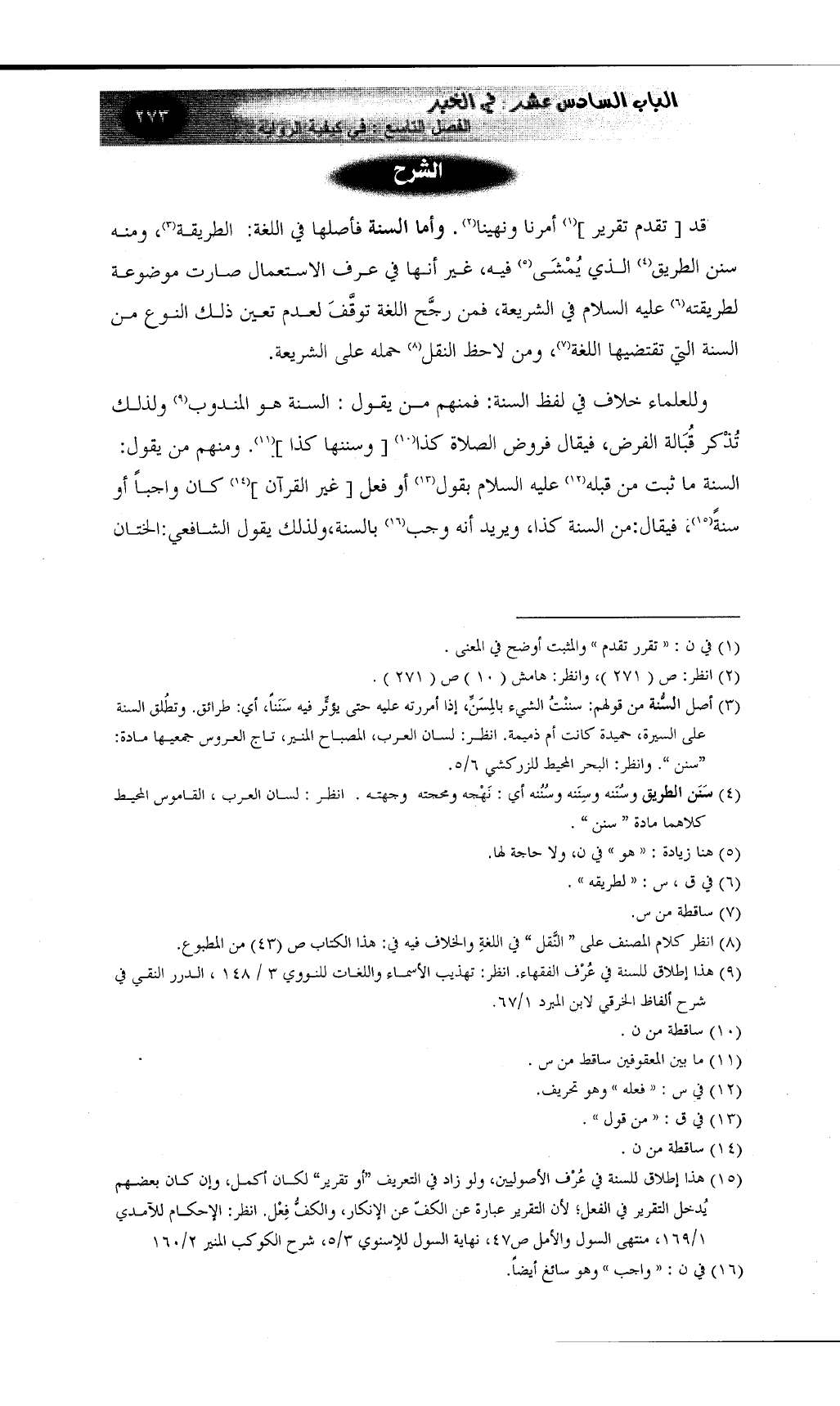 (¬15) هذا إطلاق للسنة في عُرْف الأصوليين، ولو زاد في التعريف "أو تقرير" لكان أكمل، وإن كان بعضهم يُدخل التقرير في الفعل؛ لأن التقرير عبارة عن الكفّ عن الإنكار، والكفُّ فِعْل. انظر: الإحكام للآمدي 1/169، منتهى السول والأمل ص47، نهاية السول للإسنوي 3/5، شرح الكوكب المنير 2/160