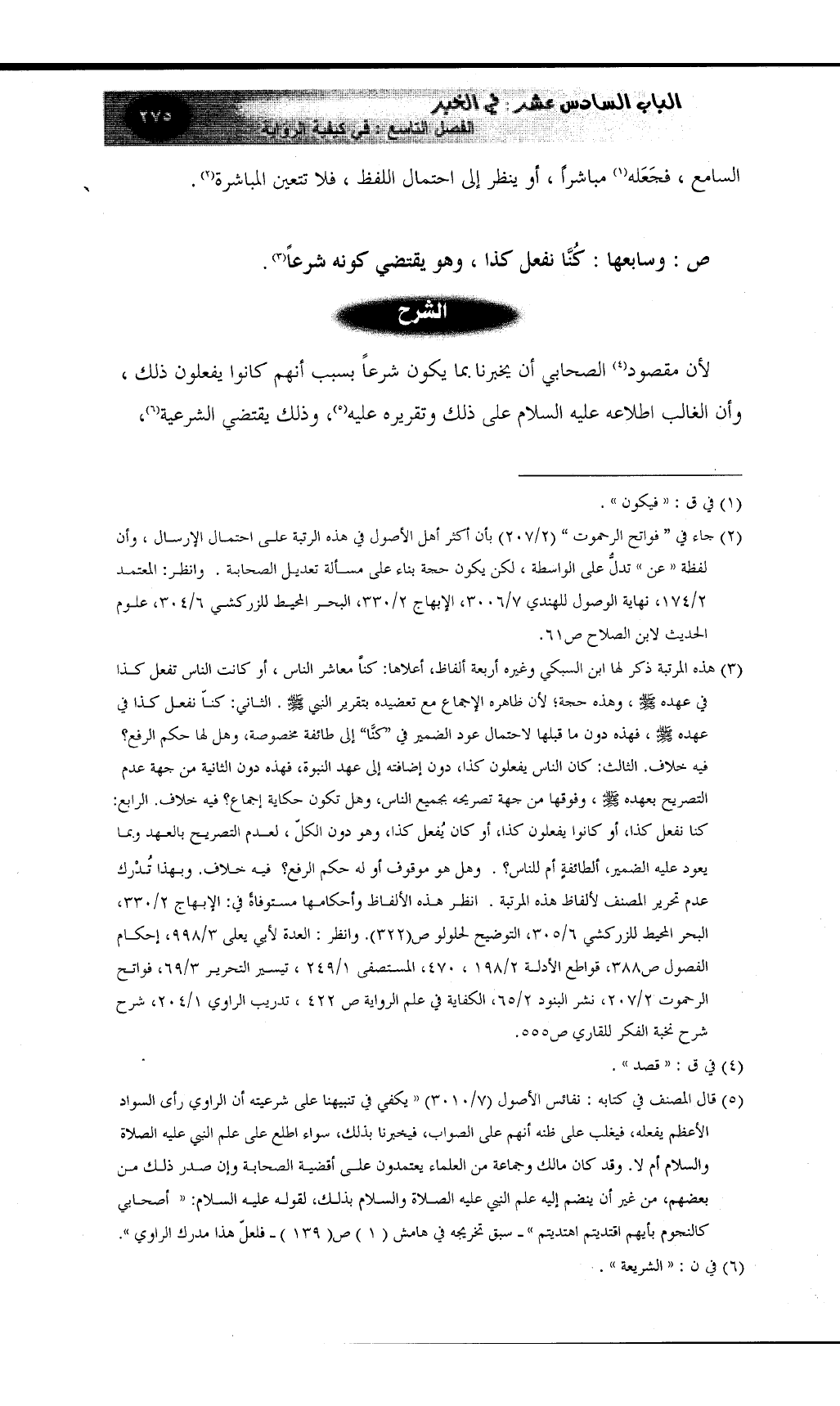 (¬3) هذه المرتبة ذكر لها ابن السبكي وغيره أربعة ألفاظ؛ أعلاها: كناَّ معاشر الناس، أو كانت الناس تفعل كذا في عهده صلى الله عليه وسلم، وهذه حجة؛ لأن ظاهره الإجماع مع تعضيده بتقرير النبي صلى الله عليه وسلم. الثاني: كناّ نفعل كذا في عهده صلى الله عليه وسلم، فهذه دون ما قبلها لاحتمال عود الضمير في "كنَّا" إلى طائفة مخصوصة، وهل لها حكم الرفع؟ فيه خلاف. الثالث: كان الناس يفعلون كذا، دون إضافته إلى عهد النبوة، فهذه دون الثانية من جهة عدم التصريح بعهده صلى الله عليه وسلم، وفوقها من جهة تصريحه بجميع الناس، وهل تكون حكاية إجماع؟ فيه خلاف. الرابع: كنا نفعل كذا، أو كانوا يفعلون كذا، أو كان يُفعل كذا، وهو دون الكلّ، لعدم التصريح بالعهد وبما يعود عليه الضمير، ألطائفةٍ أم للناس؟ . وهل هو موقوف أو له حكم الرفع؟ فيه خلاف. وبهذا تُدْرك عدم تحرير المصنف لألفاظ هذه المرتبة. انظر هذه الألفاظ وأحكامها مستوفاةً في: الإبهاج 2/330، البحر المحيط للزركشي 6/305، التوضيح لحلولو ص (322) . وانظر: العدة لأبي يعلى 3/998، إحكام الفصول ص388، قواطع الأدلة 2/198، 470، المستصفى 1/249، تيسير التحرير 3/69، فواتح الرحموت 2/207، نشر البنود 2/65، الكفاية في علم الرواية ص 422، تدريب الراوي 1/204، شرح شرح نخبة الفكر للقاري ص555.