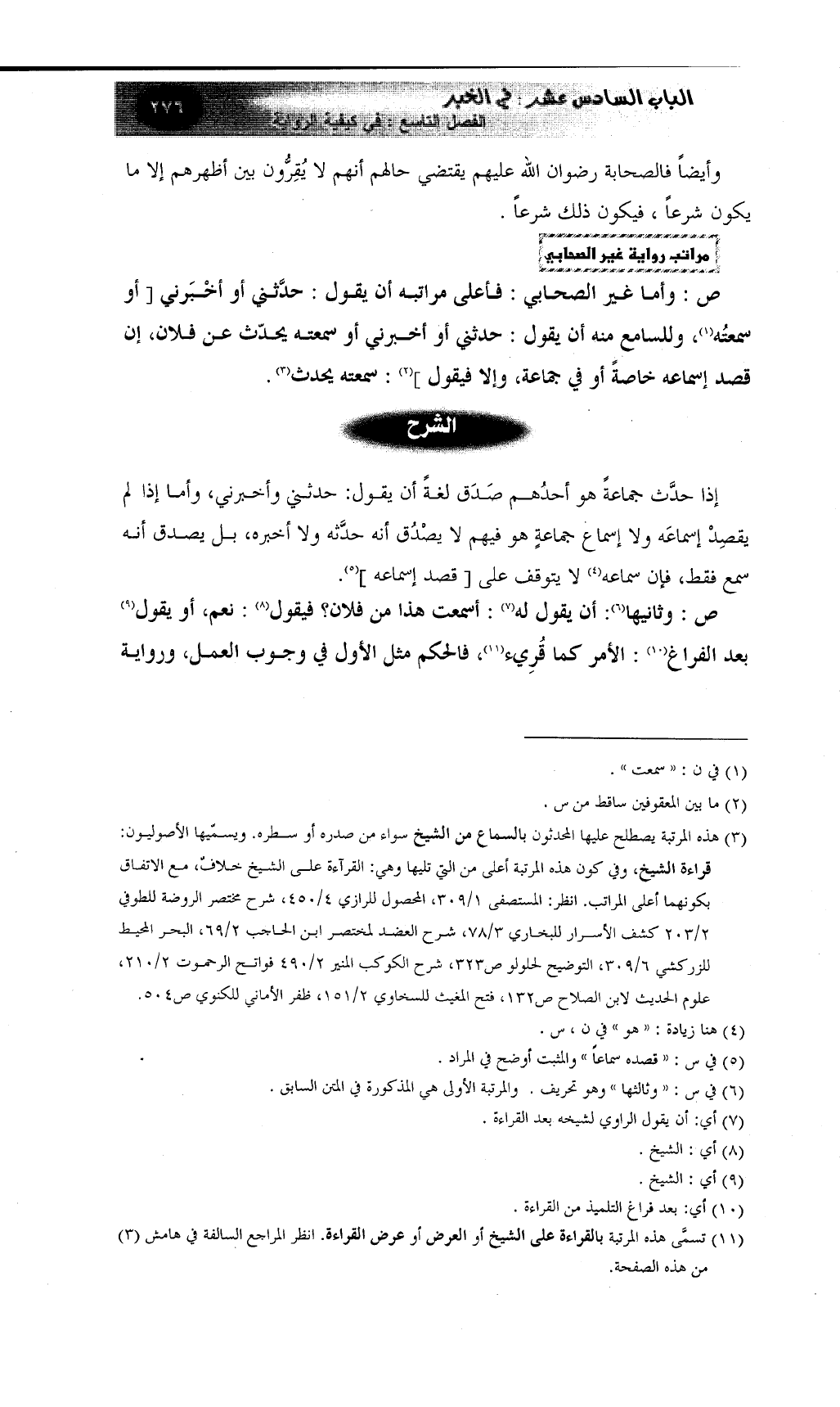 (¬3) هذه المرتبة يصطلح عليها المحدثون بالسماع من الشيخ سواء من صدره أو سطره. ويسمّيها الأصوليون: قراءة الشيخ، وفي كون هذه المرتبة أعلى من التي تليها وهي: القرآءة على الشيخ خلافٌ، مع الاتفاق بكونهما أعلى المراتب. انظر: المستصفى 1/309، المحصول للرازي 4/450، شرح مختصر الروضة للطوفي 2/203 كشف الأسرار للبخاري 3/78، شرح العضد لمختصر ابن الحاجب 2/69، البحر المحيط للزركشي 6/309، التوضيح لحلولو ص323، شرح الكوكب المنير 2/490 فواتح الرحموت 2/210، علوم الحديث لابن الصلاح ص132، فتح المغيث للسخاوي 2/151، ظفر الأماني للكنوي ص504.