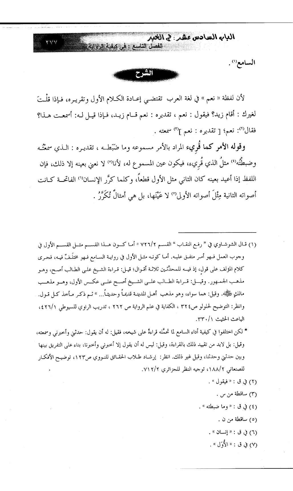 * لكن اختلفوا في كيفية أداء السامع لما تحمَّله قراءةً على شيخه، فقيل: له أن يقول: حدثني وأخبرني وسمعته، وقيل: بل لابد من تقييد ذلك بالقراءة، وقيل: ليس له أن يقول إلا أخبرني وأخبرنا، بناء على التفريق بينها وبين حدثني وحدثنا، وقيل غير ذلك. انظر: إرشاد طلاب الحقائق للنووي ص123، توضيح الأفكار للصنعاني 2/188، توجيه النظر للجزائري 2/712.