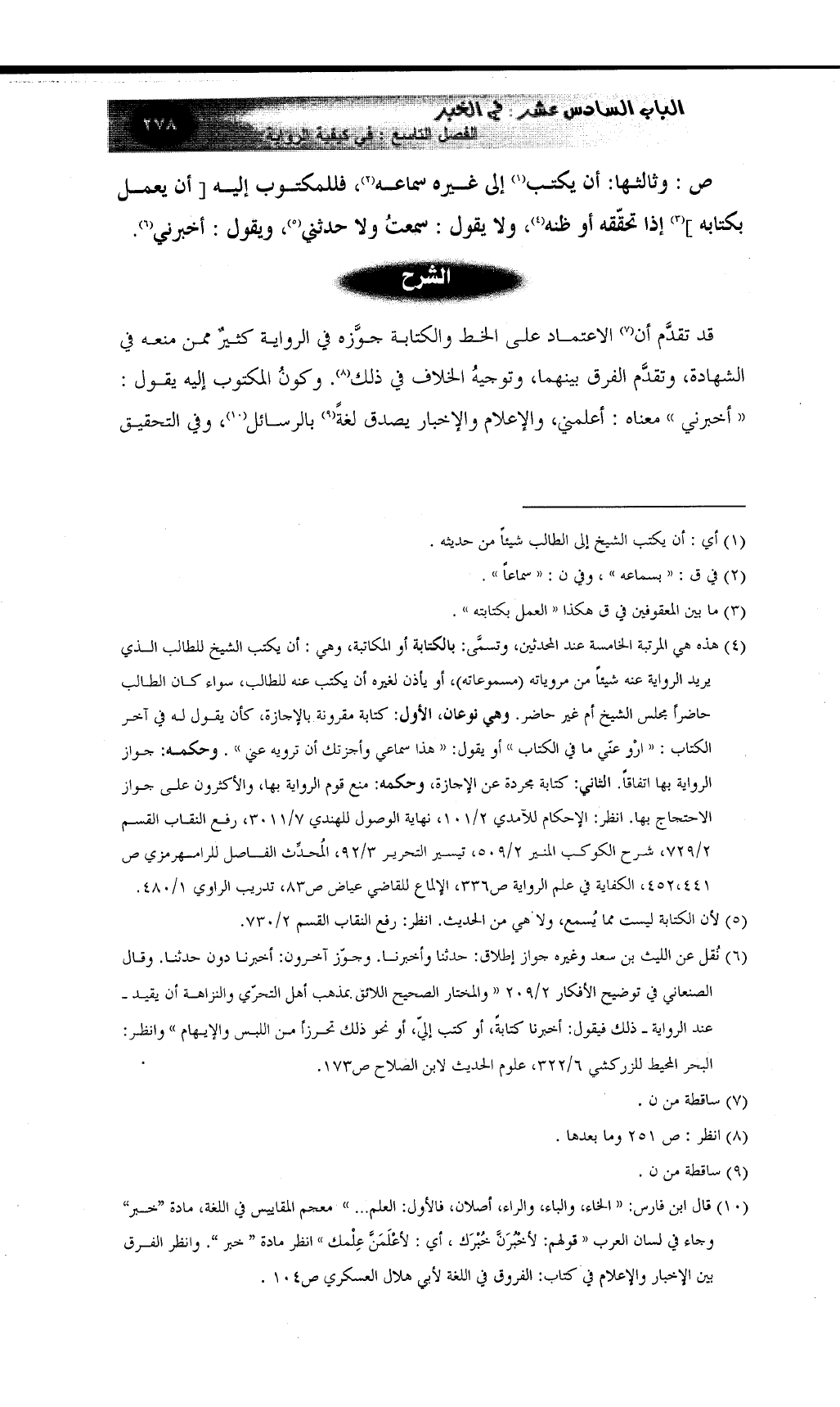 (¬6) نُقل عن الليث بن سعد وغيره جواز إطلاق: حدثنا وأخبرنا. وجوّز آخرون: أخبرنا دون حدثنا. وقال الصنعاني في توضيح الأفكار 2/209 ((والمختار الصحيح اللائق بمذهب أهل التحرّي والنزاهة أن يقيد ـ عند الرواية ـ ذلك فيقول: أخبرنا كتابةً، أو كتب إليّ، أو نحو ذلك تحرزاً من اللبس والإيهام)) وانظر: البحر المحيط للزركشي 6/322، علوم الحديث لابن الصلاح ص173.
